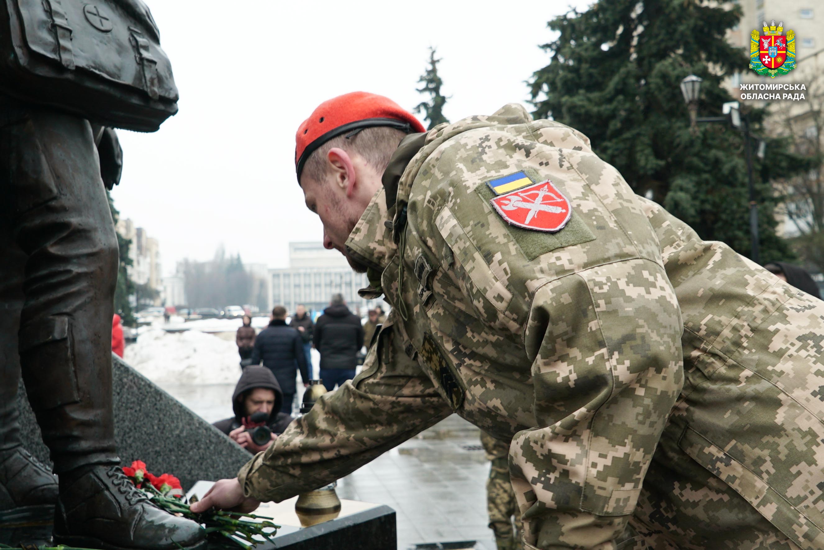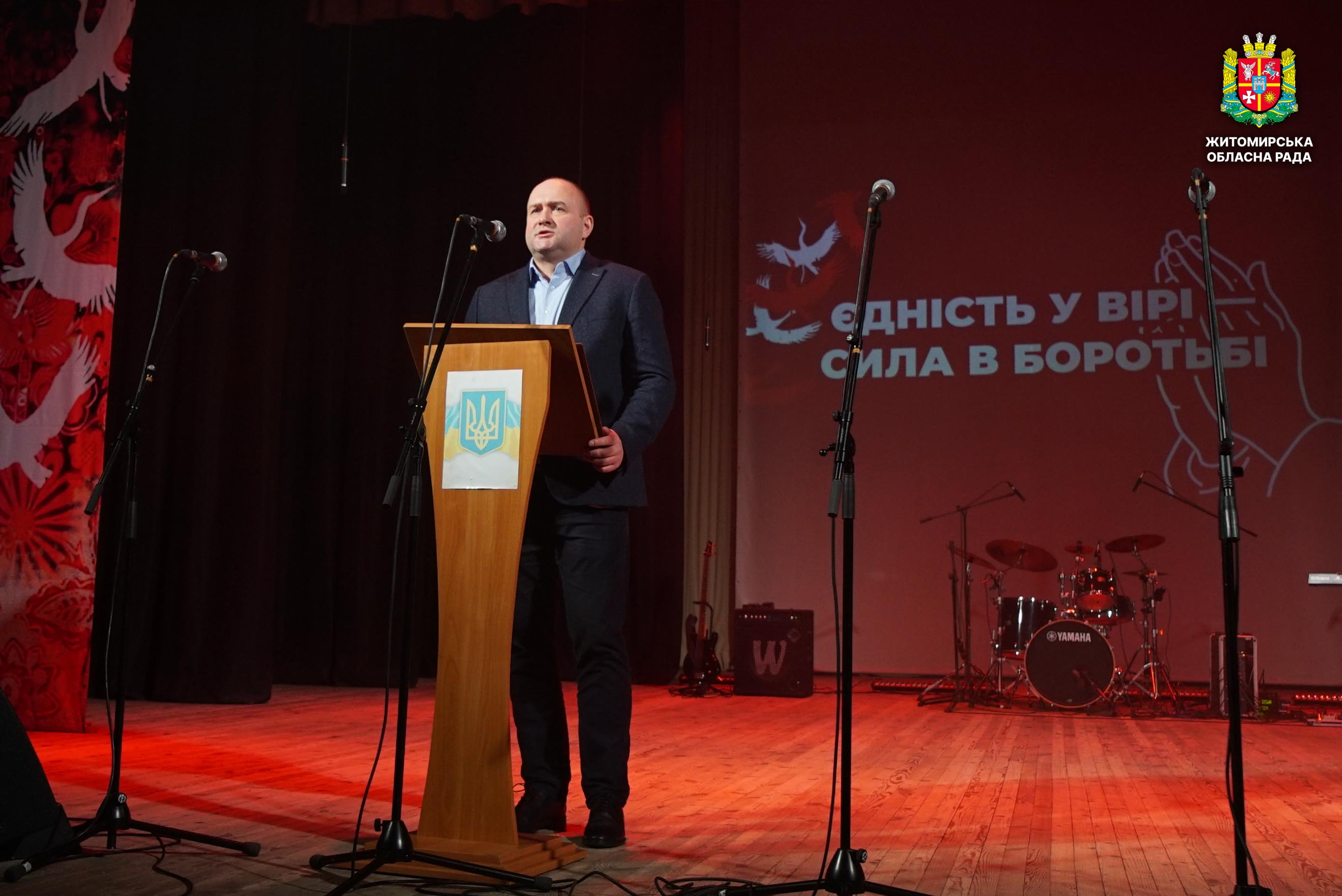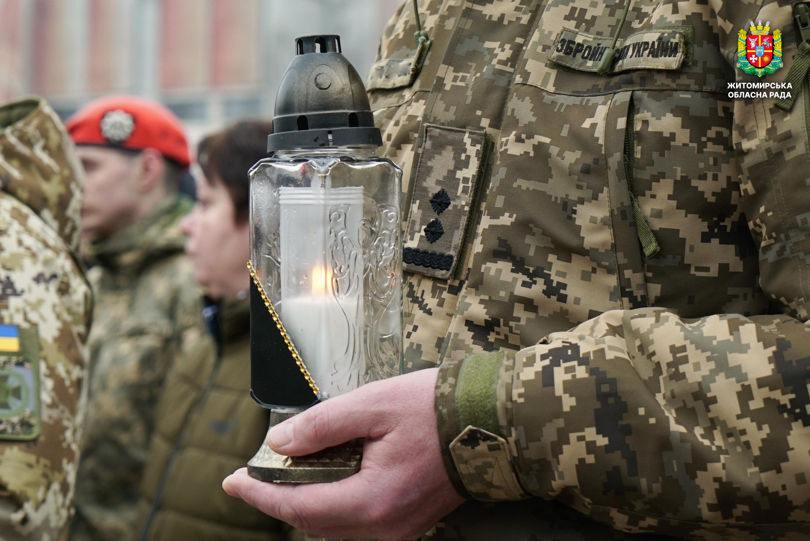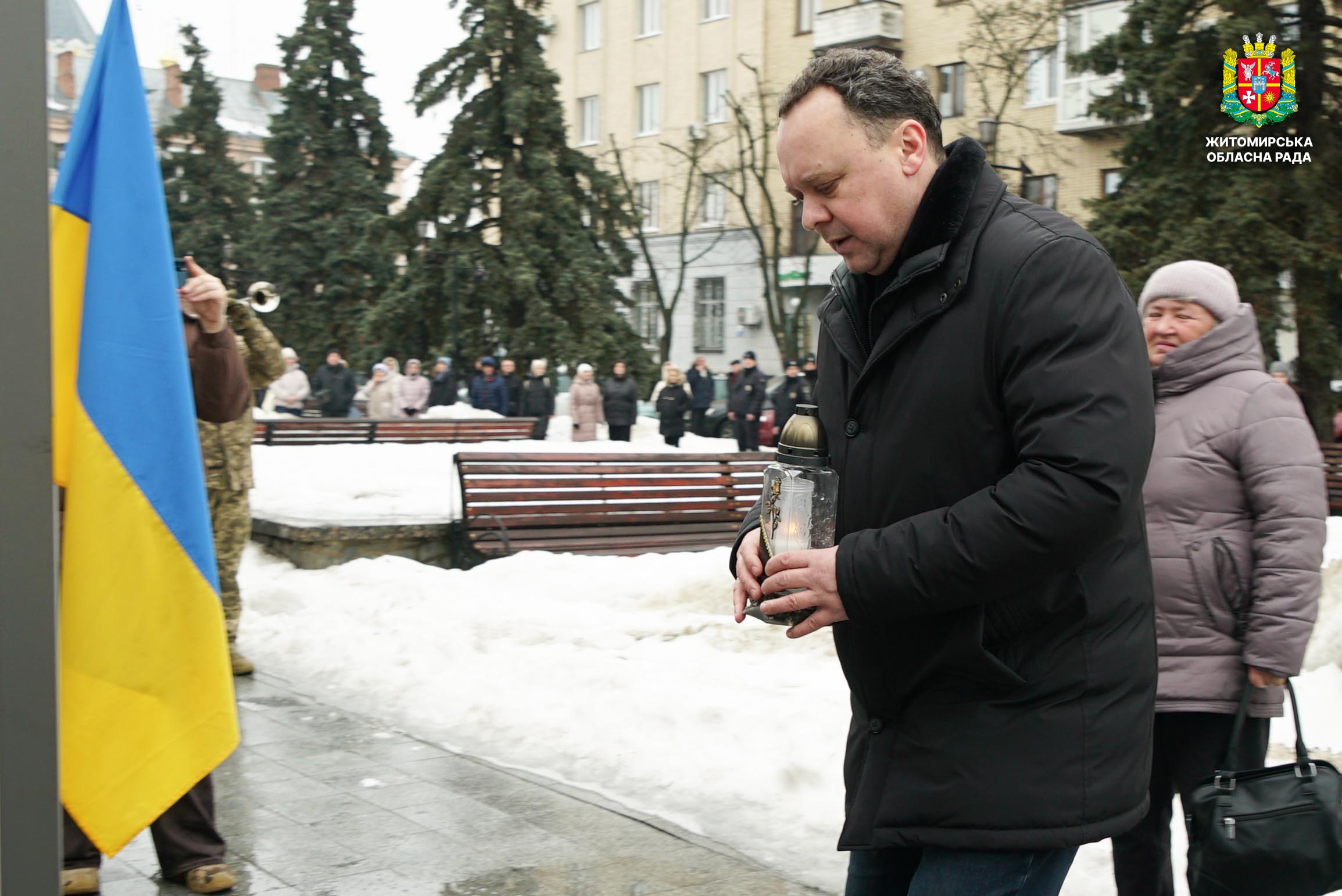 Чотири роки незламності: пам’ять, молитва і вдячність Героям 24 лютого 2026 року — четверта річниця повномасштабного вторгнення росії в Україну. Цей день про тих, хто віддав життя за свободу країни, і про силу народу, який встояв і продовжує боротися за своє майбутнє. Символічно, що цього дня відзначають Національний день молитви — день духовної єдності та спільного прохання про мир, захист і перемогу. З нагоди четвертої річниці повномасштабного російського вторгнення та Національного дня молитви у Житомирі відбулися пам’ятні заходи. У вшануваннях взяли участь перший заступник голови Житомирської обласної ради Олег Дзюбенко, керівництво Житомирської обласної військової адміністрації та Житомирської міської ради, представники виконавчого апарату обласної ради, духовенство, військові, правоохоронці, родини загиблих та громадськість. Меморіальний захід, сповнений скорботи та вдячності, пройшов на Алеї Слави Героїв. Присутні вшанували пам’ять полеглих воїнів хвилиною мовчання, спільно виконали Державний Гімн України у супроводі оркестру 199-го навчального центру Десантно-штурмових військ ЗСУ та встановили лампади до пам'ятних стендів. Представники Ради Християнських Церков Житомирщини провели поминальний молебень. Учасники заходу також вшанували пам’ять Героїв біля пам’ятного знака «Захисникам України у війні з російським агресором» на майдані Перемоги та меморіальних стендів загиблих і померлих учасників Антитерористичної операції та Операції об’єднаних сил. Опісля вшанування продовжилися у Житомирській обласній філармонії імені Святослава Ріхтера, де відбувся духовно-мистецький захід під назвою «Єдність у вірі — сила в боротьбі». Програма поєднала музику, слово та спільну молитву за Україну. «Сьогодні ми вшановуємо наших Героїв, які віддали життя за свободу України, і дякуємо всім, хто продовжує цю боротьбу. Наша сила — у єдності, у підтримці одне одного та вірі, яка не дає нам зламатися навіть у найтемніші часи. Поки ми разом — Україна непереможна», — зазначив перший заступник голови Житомирської обласної ради Олег Дзюбенко. Завершився захід проникливою композицією «Моє ім’я – Україна», що стала символом любові до Батьківщини та віри у її майбутнє.