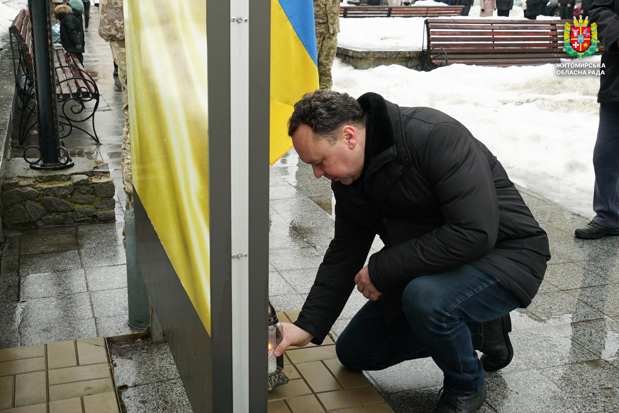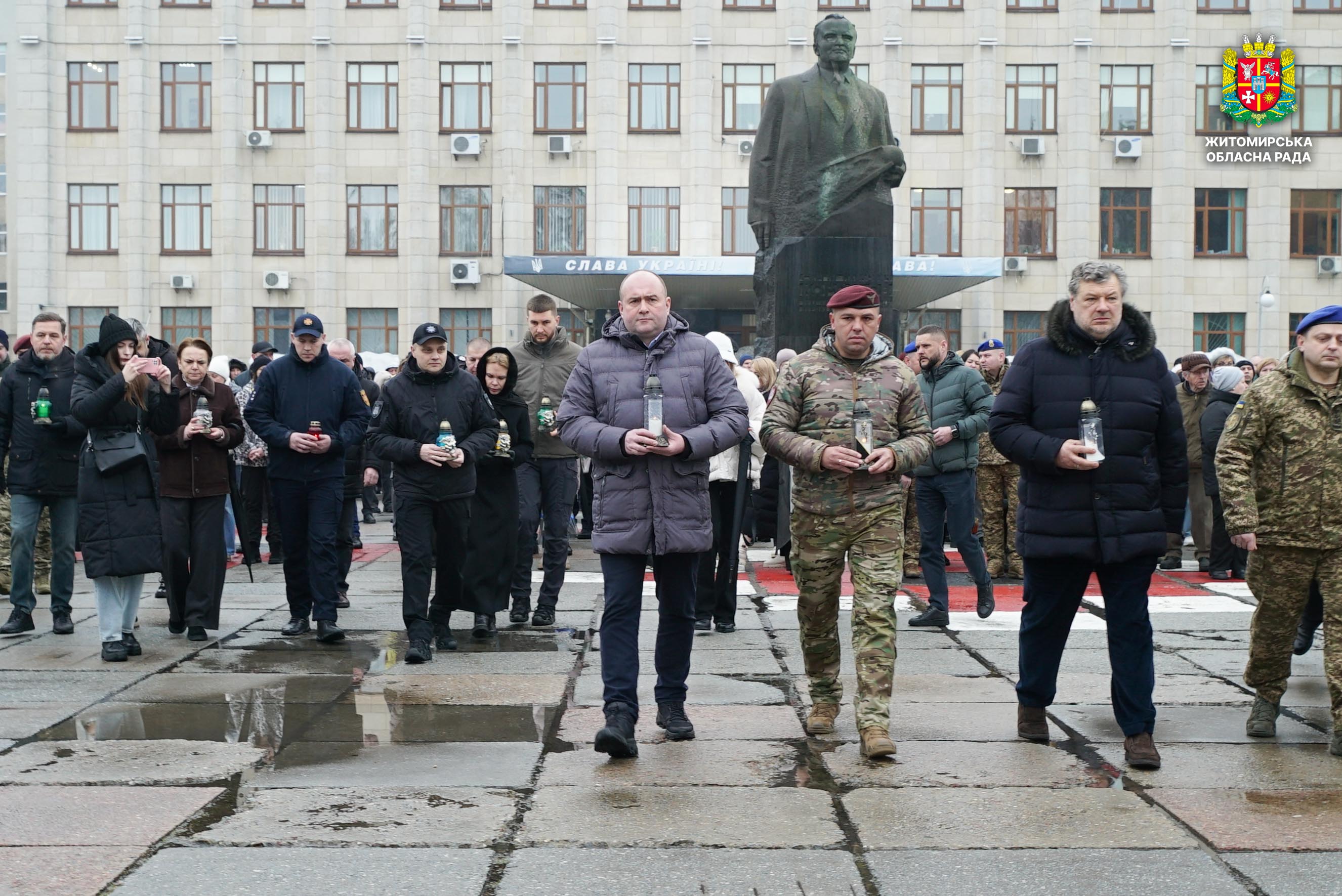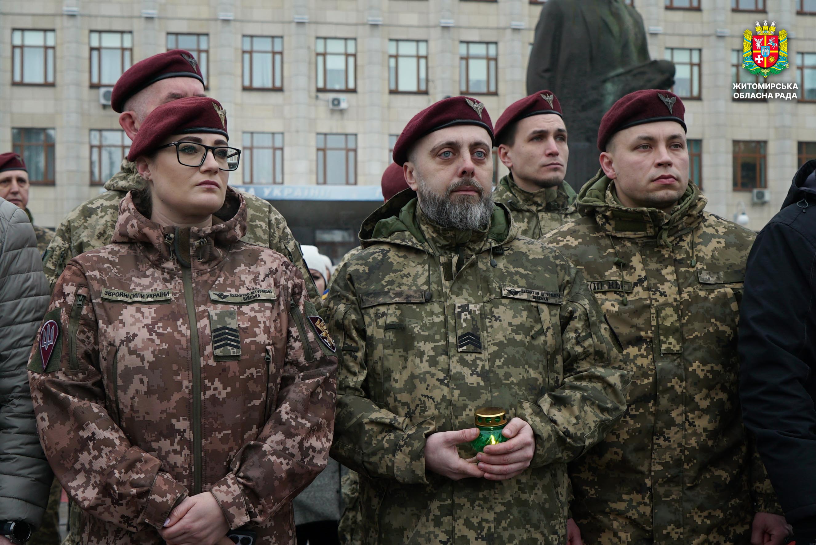 Чотири роки незламності: пам’ять, молитва і вдячність Героям 24 лютого 2026 року — четверта річниця повномасштабного вторгнення росії в Україну. Цей день про тих, хто віддав життя за свободу країни, і про силу народу, який встояв і продовжує боротися за своє майбутнє. Символічно, що цього дня відзначають Національний день молитви — день духовної єдності та спільного прохання про мир, захист і перемогу. З нагоди четвертої річниці повномасштабного російського вторгнення та Національного дня молитви у Житомирі відбулися пам’ятні заходи. У вшануваннях взяли участь перший заступник голови Житомирської обласної ради Олег Дзюбенко, керівництво Житомирської обласної військової адміністрації та Житомирської міської ради, представники виконавчого апарату обласної ради, духовенство, військові, правоохоронці, родини загиблих та громадськість. Меморіальний захід, сповнений скорботи та вдячності, пройшов на Алеї Слави Героїв. Присутні вшанували пам’ять полеглих воїнів хвилиною мовчання, спільно виконали Державний Гімн України у супроводі оркестру 199-го навчального центру Десантно-штурмових військ ЗСУ та встановили лампади до пам'ятних стендів. Представники Ради Християнських Церков Житомирщини провели поминальний молебень. Учасники заходу також вшанували пам’ять Героїв біля пам’ятного знака «Захисникам України у війні з російським агресором» на майдані Перемоги та меморіальних стендів загиблих і померлих учасників Антитерористичної операції та Операції об’єднаних сил. Опісля вшанування продовжилися у Житомирській обласній філармонії імені Святослава Ріхтера, де відбувся духовно-мистецький захід під назвою «Єдність у вірі — сила в боротьбі». Програма поєднала музику, слово та спільну молитву за Україну. «Сьогодні ми вшановуємо наших Героїв, які віддали життя за свободу України, і дякуємо всім, хто продовжує цю боротьбу. Наша сила — у єдності, у підтримці одне одного та вірі, яка не дає нам зламатися навіть у найтемніші часи. Поки ми разом — Україна непереможна», — зазначив перший заступник голови Житомирської обласної ради Олег Дзюбенко. Завершився захід проникливою композицією «Моє ім’я – Україна», що стала символом любові до Батьківщини та віри у її майбутнє.