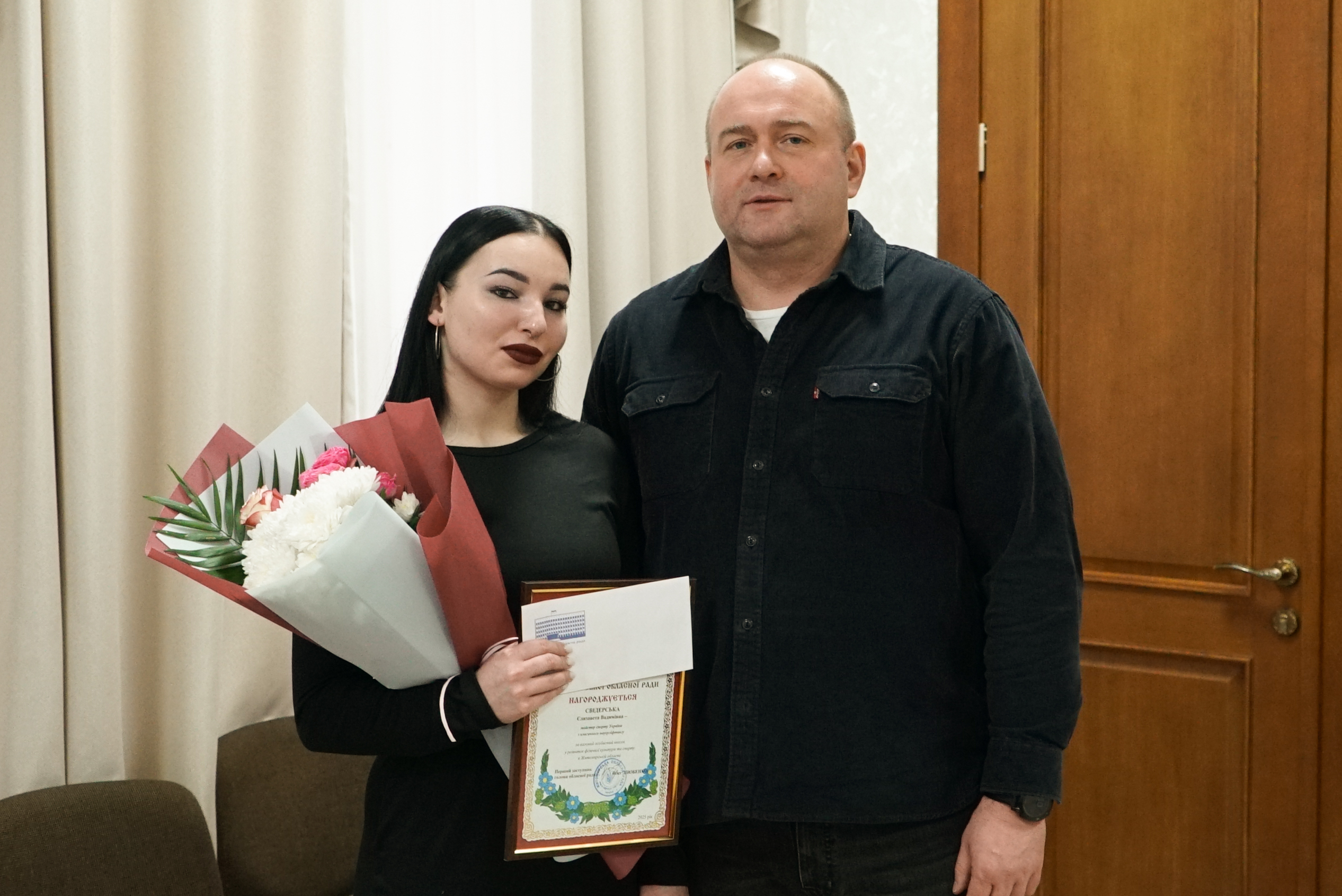 Олег Дзюбенко вручив відзнаки Житомирської обласної ради спортсменкам з пауерліфтингу 19 грудня перший заступник голови Житомирської обласної ради Олег Дзюбенко зустрівся зі спортсменкою з Бердичева — Єлизаветою Свідерською та її тренеркою Іриною Данилюк, які демонструють високі професійні результати та гідно представляють Житомирщину на всеукраїнських і міжнародних змаганнях з пауерліфтингу. Єлизавета Свідерська — майстер спорту України з класичного пауерліфтингу, дворазова чемпіонка України серед юніорок, чемпіонка України з класичного жиму лежачи, бронзова призерка Кубку України з класичного пауерліфтингу серед дорослих. Її наставниця, Ірина Данилюк, — тренерка, майстер спорту України міжнародного класу з пауерліфтингу, багаторазова чемпіонка та рекордсменка України, срібна призерка чемпіонату Європи з пауерліфтингу та бронзова призерка чемпіонату Європи з класичного пауерліфтингу. Високі результати спортсменки та професійна робота її тренерки підтримують розвиток спорту в області та сприяють вихованню молоді, заохочуючи до здорового способу життя. На знак визнання цих досягнень Олег Дзюбенко вручив Єлизаветі Свідерській та Ірині Данилюк грамоти Житомирської обласної ради. Нагородження відбулося за поданням депутатки обласної ради, директорки Національного музею космонавтики імені Сергія Павловича Корольова Ірини Дячук. «Щира вдячність за вашу відданість спорту та вагомі досягнення, які прославляють Житомирщину та зміцнюють авторитет області на спортивній арені»,— зазначив перший заступник голови обласної ради. Також під час зустрічі присутні обговорили перспективи розвитку пауерліфтингу в області, залучення молоді до занять спортом та популяризацію фізичної культури.