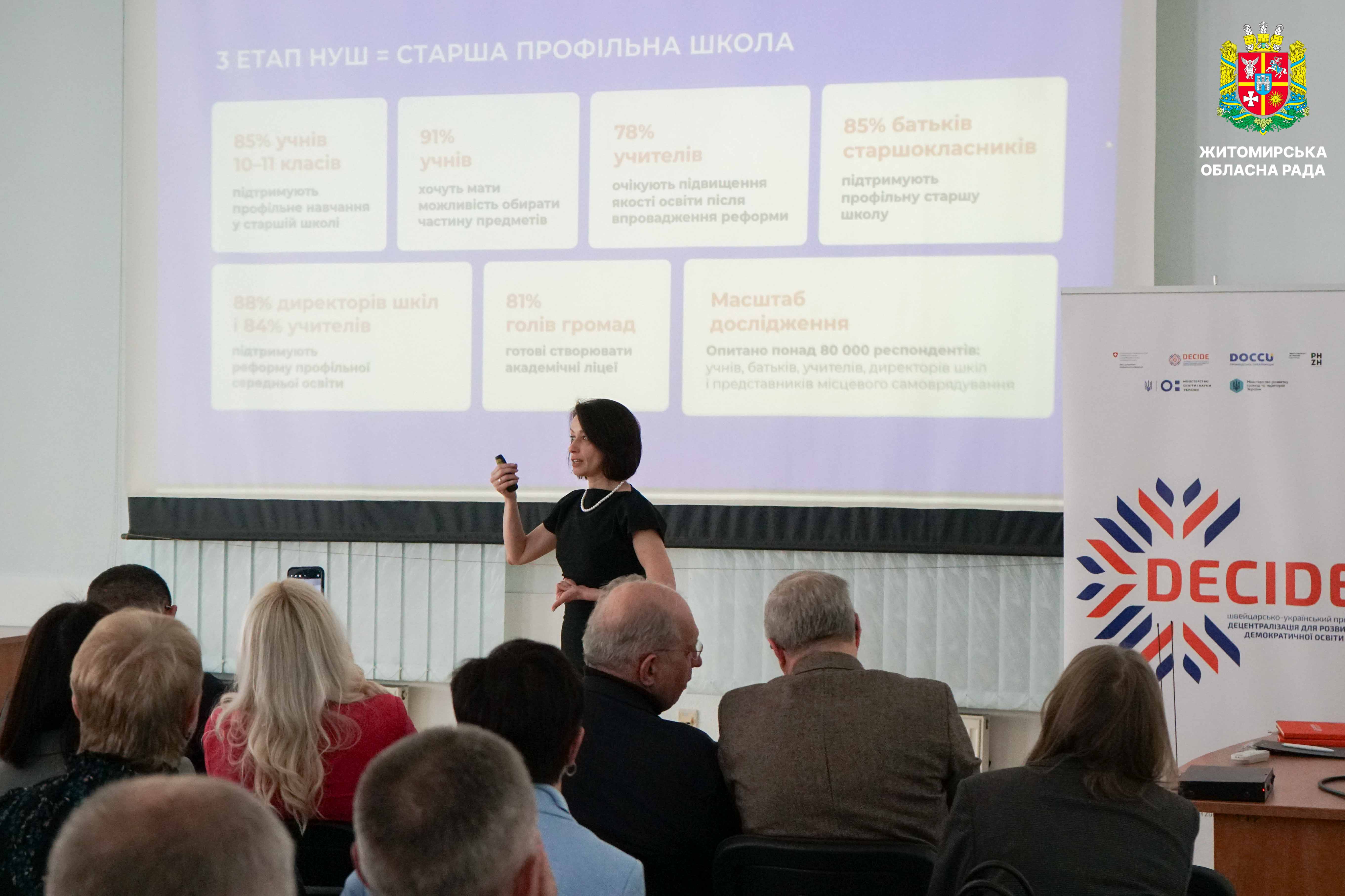 У Житомирі обговорили впровадження реформи старшої профільної школи 15 квітня у Житомирі відбувся семінар-практикум «Реформа старшої профільної школи: можливості і виклики для громади», організований у межах швейцарсько-українського проєкту DECIDE у співпраці з Міністерством освіти і науки України. У заході взяли участь представники центральних органів влади, місцевого самоврядування, освітньої галузі та експертного середовища. Зокрема, заступниця Міністра освіти і науки України Надія Кузьмичова, народні депутати України Богдан Кицак та Сергій Кузьміних, депутатка Житомирської обласної ради Людмила Кицак, менеджерка проєкту DECIDE Валентина Полторак, керівництво Житомирської обласної військової адміністрації. Під час заходу обговорили державну та регіональну політику у сфері профільної середньої освіти, а також практичні аспекти впровадження реформи на рівні громад. Йшлося, зокрема, про формування спроможної мережі ліцеїв, прийняття управлінських рішень на основі даних, реалізацію освітньої субвенції у 2026 році та розвиток співробітництва територіальних громад у сфері освіти. Як зазначила Людмила Кицак, реформа старшої профільної школи потребує відповідальних і виважених рішень. «Реформа старшої профільної школи — це про якість освіти і майбутнє наших дітей. Для громад сьогодні важливо не лише розуміти зміст змін, а й мати практичні інструменти для їх реалізації. Такі заходи дають можливість обмінюватися досвідом, знаходити відповіді на ключові питання та приймати обґрунтовані рішення. Лише спільна і злагоджена робота дозволить досягти якісного результату», — наголосила депутатка. У межах програми семінару учасники також ознайомилися з практичним досвідом організації освітнього процесу під час навчального візиту до ліцею №12 м. Житомира імені С. Ковальчука.