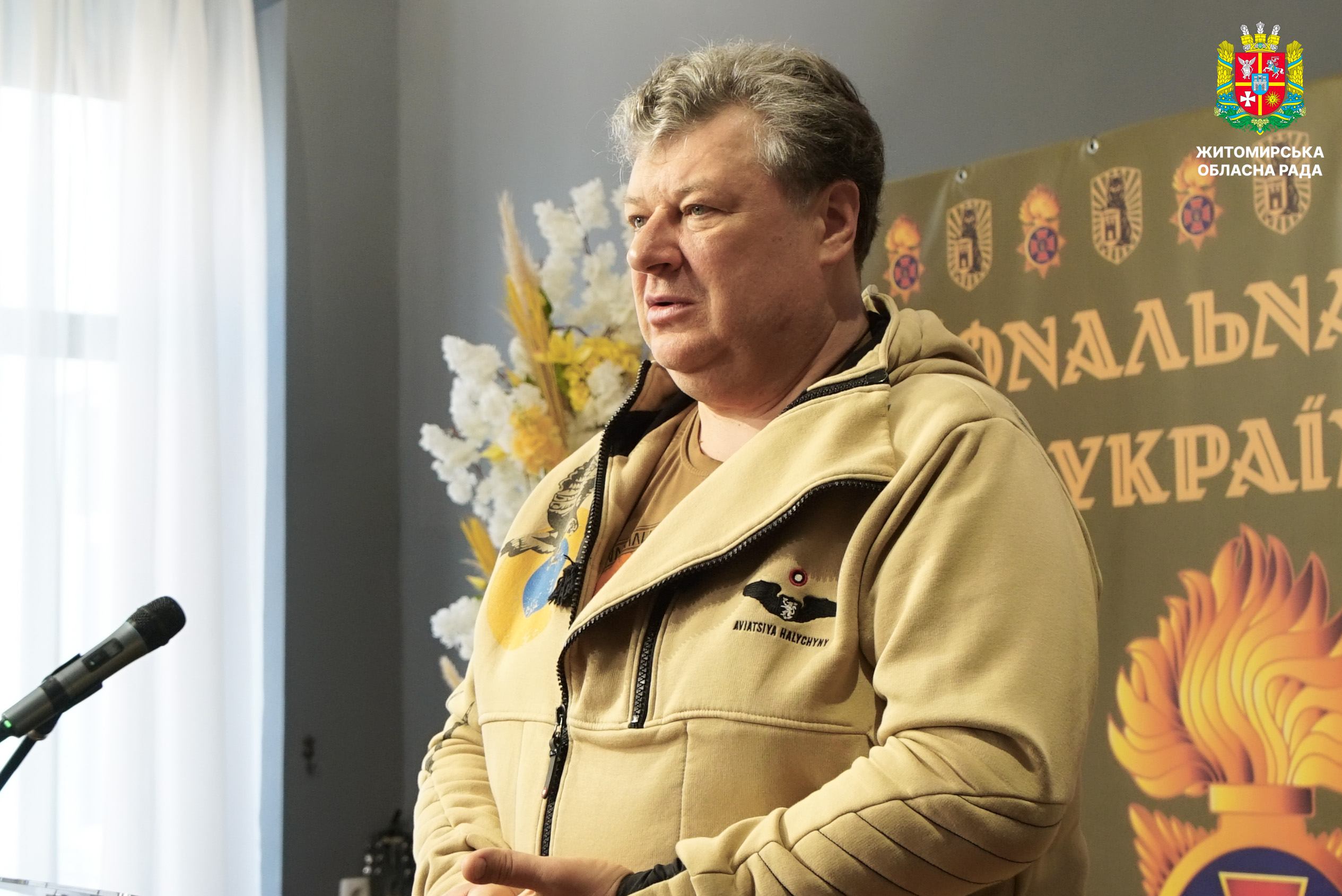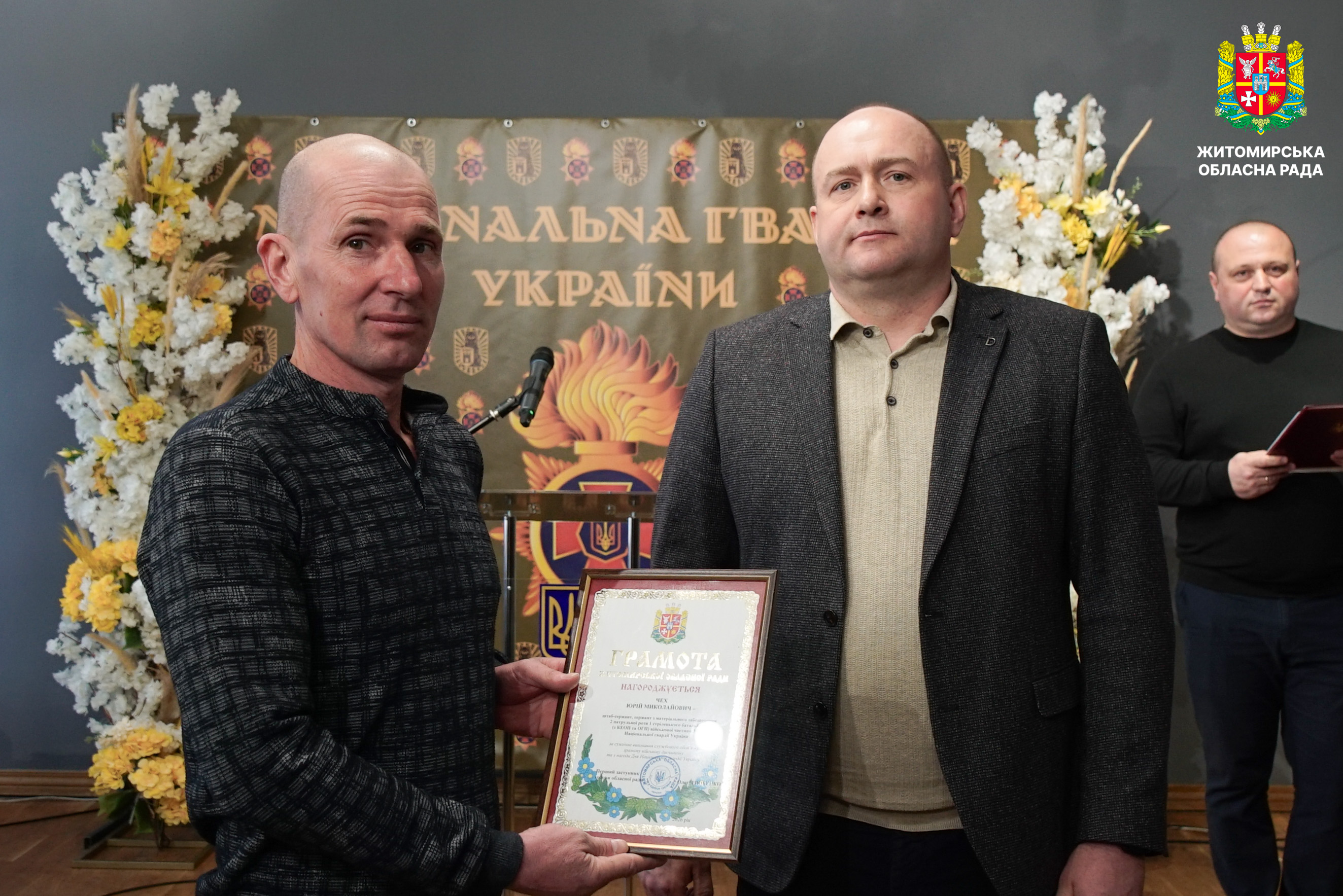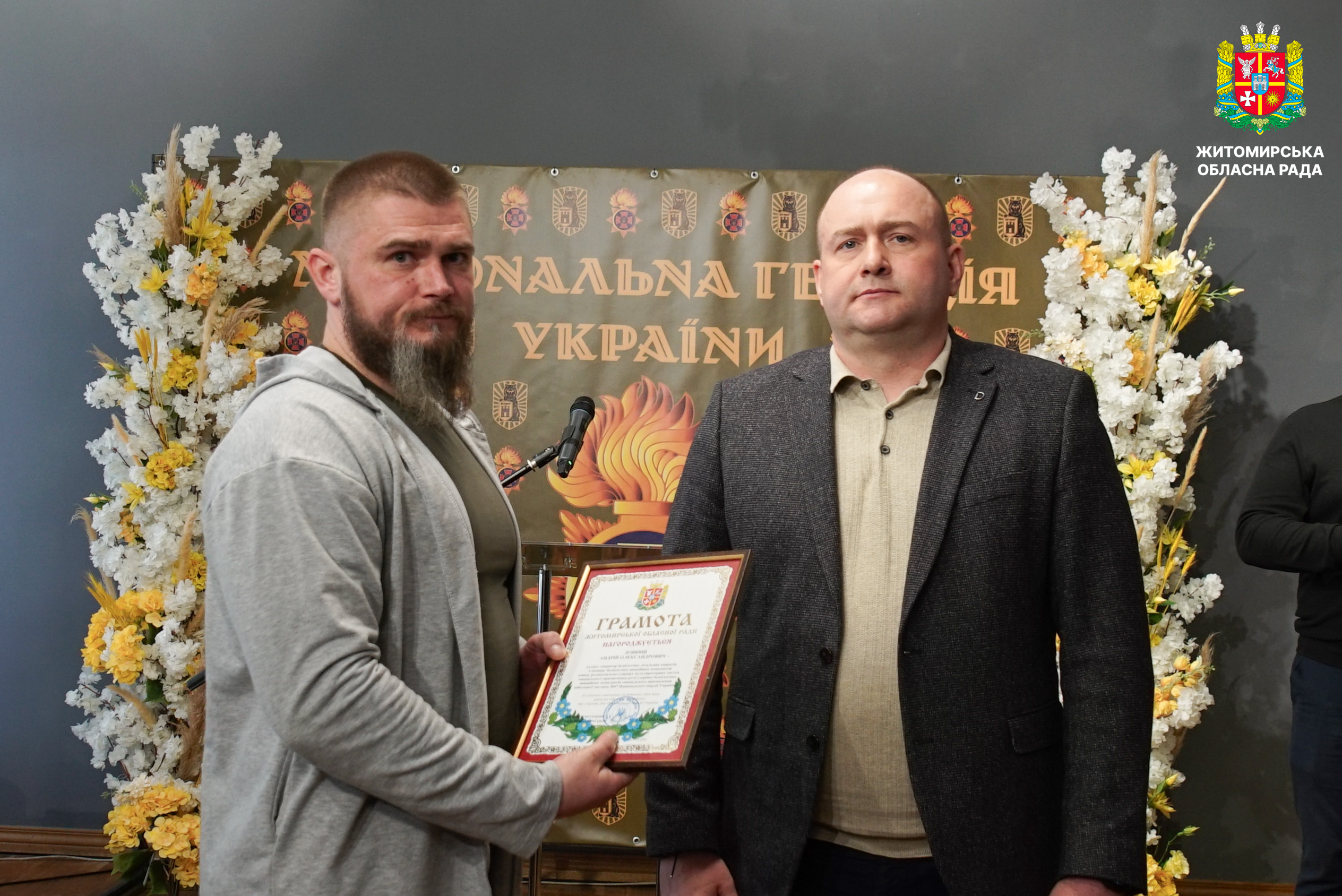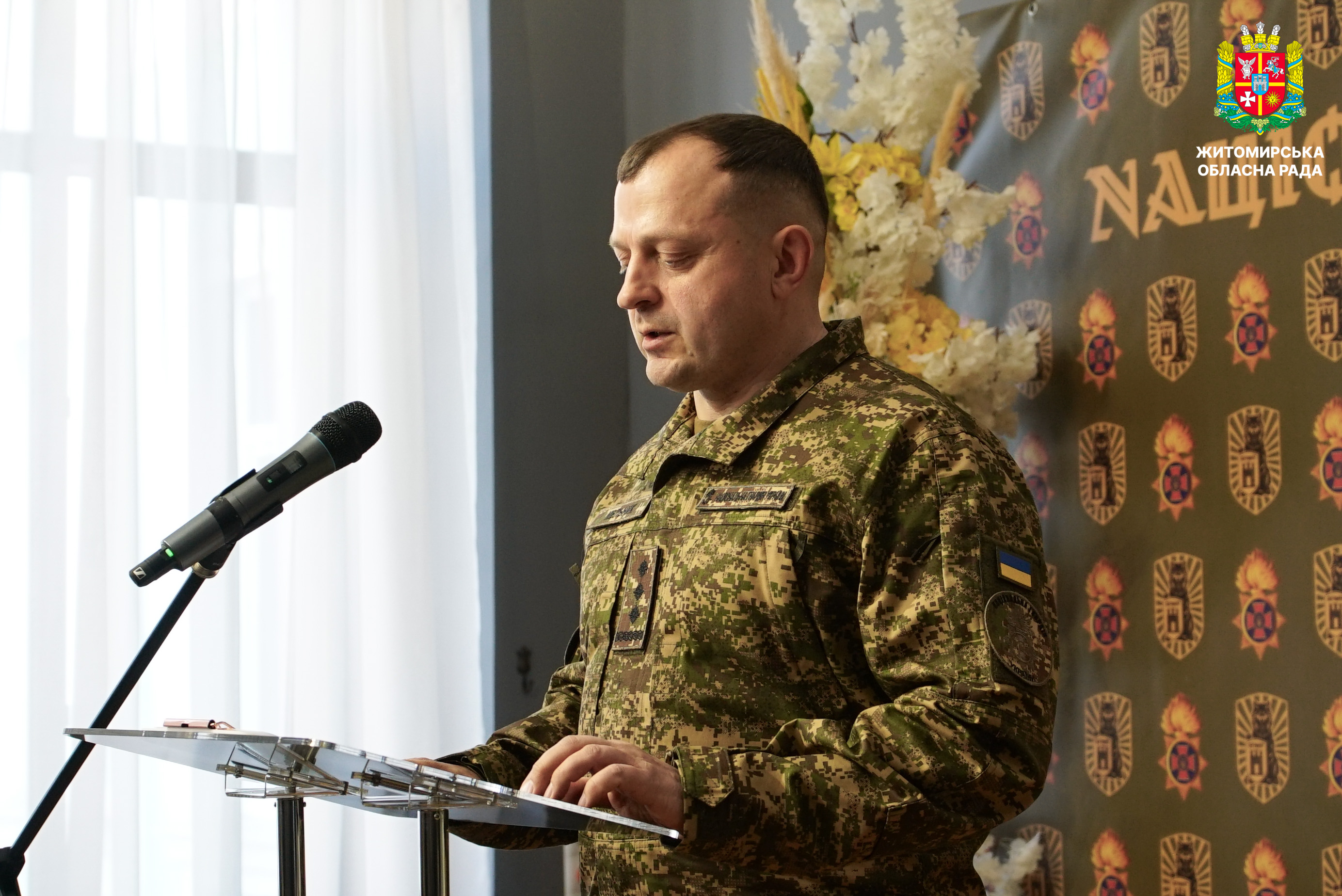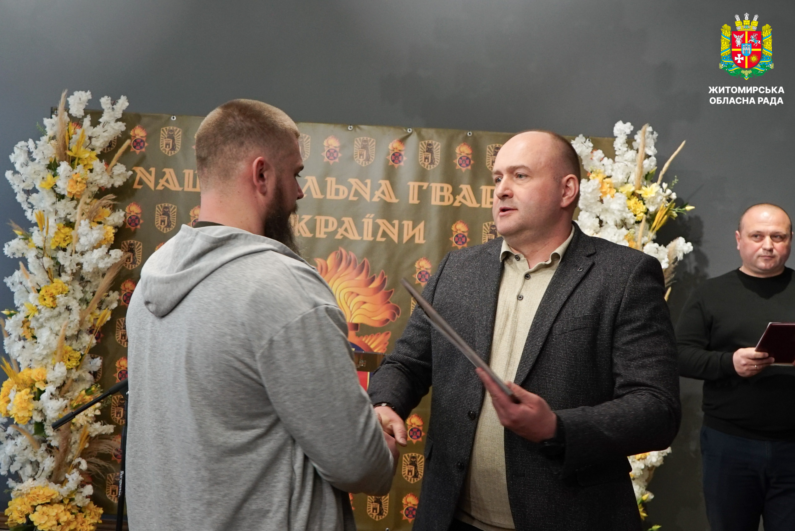 У Житомирі відбулися урочистості з нагоди 12-ї річниці створення Національної гвардії України 26 березня у Житомирі відбувся урочистий захід до Дня Національної гвардії України — професійного свята, що відзначає роль Національної гвардії у захисті суверенітету України, її територіальної цілісності, життя, законних прав і свобод громадян. У заході взяли участь перший заступник голови Житомирської обласної ради Олег Дзюбенко, начальник Житомирської обласної військової адміністрації Віталій Бунечко, секретар Житомирської міської ради Галина Шиманська, представники духовенства та військові. Від імені всього депутатського корпусу та від себе особисто Олег Дзюбенко привітав військовослужбовців із професійним святом, а також вручив грамоти та подяки. «Ваша служба — це внесок у безпеку і стабільність нашої країни. Ви завжди на варті життя і спокою. Дякуємо вам за силу духу та відданість обов’язку. Окрема подяка вашим родинам, адже за кожним сильним воїном стоять ті, хто чекає, підтримує і вірить», — зазначив Олег Дзюбенко у своєму вітальному слові. З привітаннями до присутніх також звернулися начальник Житомирської ОВА, секретар міської ради, представники духовенства та інші гості. Під час заходу діяла фотовиставка «Війна в об’єктиві», присвячена 12-й річниці створення Національної гвардії України. У світлинах — щоденне життя гвардійців, їхня служба, випробування війною та цінність простих людських моментів.