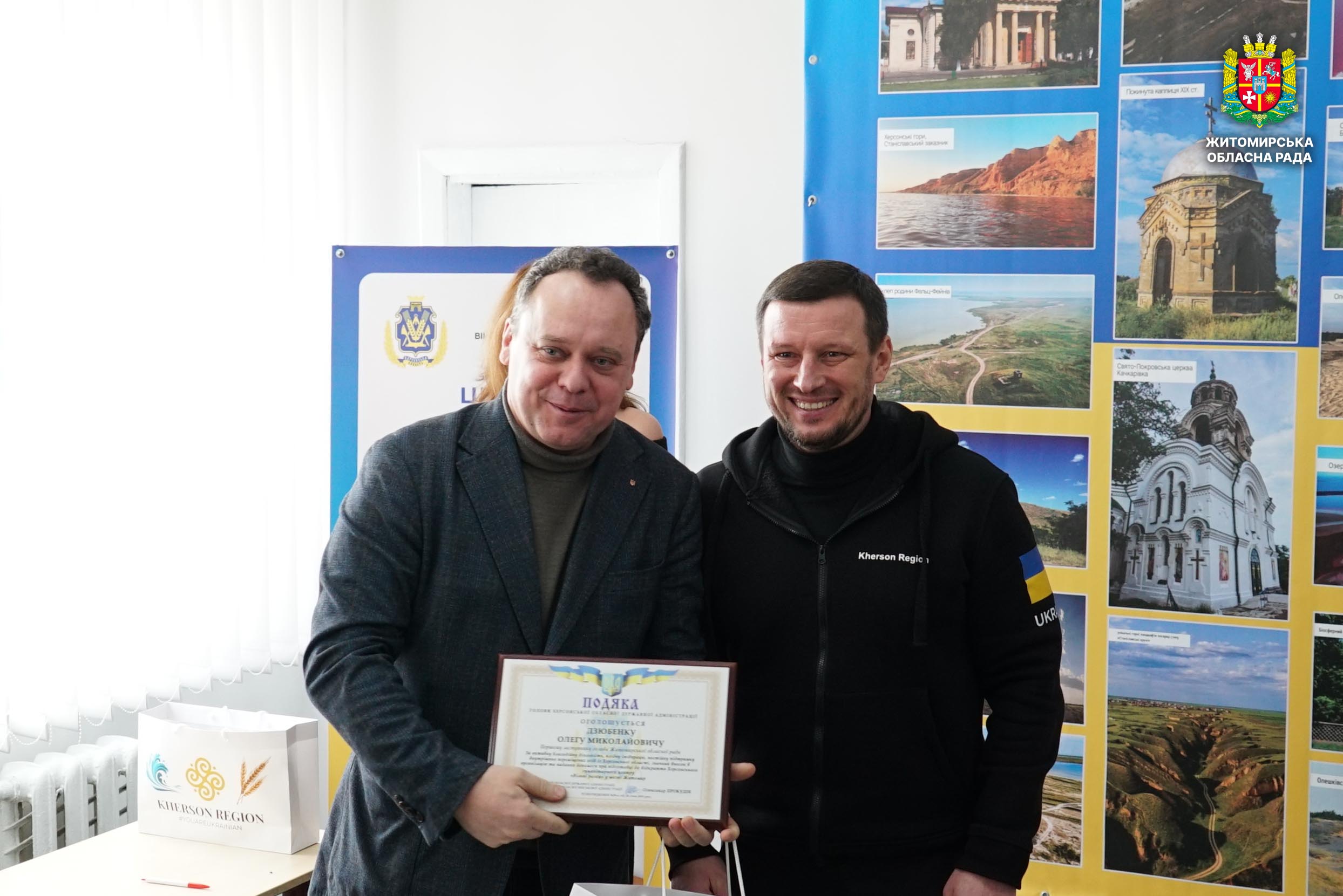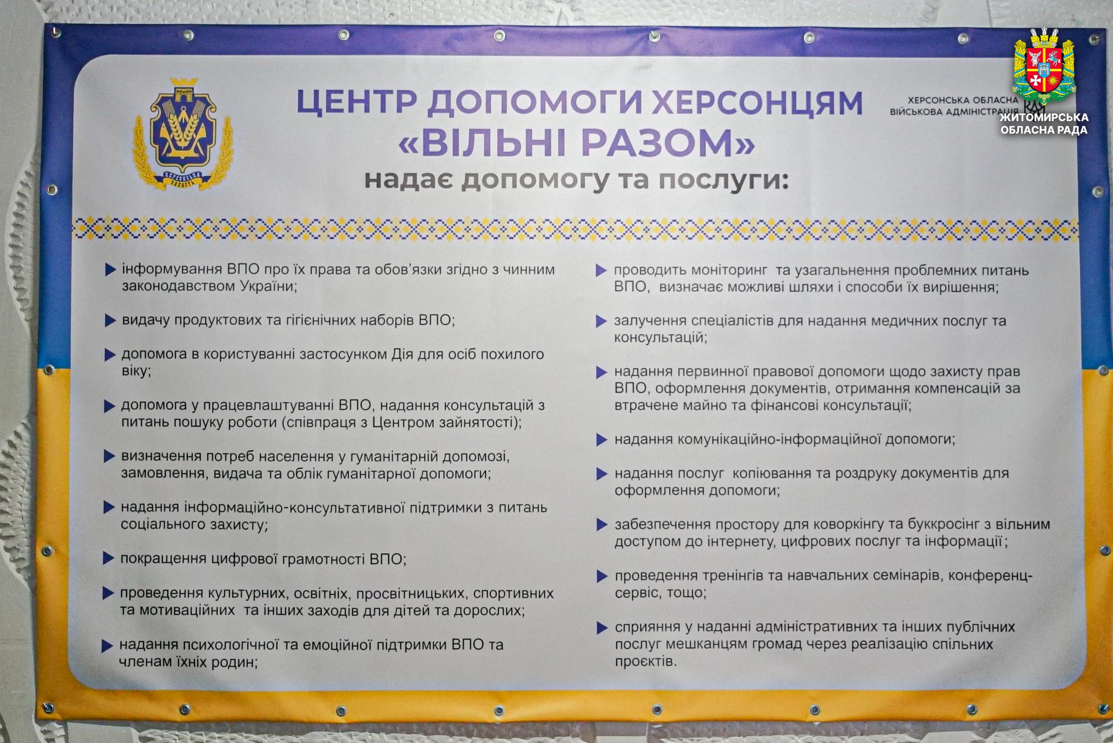 У Житомирі відкрили центр допомоги ВПО з Херсонщини «Вільні разом» 6 лютого у Житомирі відбулося відкриття центру допомоги внутрішньо переміщеним особам з Херсонської області «Вільні разом». Центр створено для надання комплексної підтримки жителям Херсонщини, які через війну були змушені залишити свої домівки та знайшли прихисток на Житомирщині. У заході взяли участь начальник Херсонської обласної військової адміністрації Олександр Прокудін, начальник Житомирської обласної військової адміністрації Віталій Бунечко, керуючий справами виконавчого апарату Житомирської обласної ради Віктор Назар, секретар Житомирської міської ради Галина Шиманська, представники органів влади, громадських і благодійних організацій, міжнародних партнерів та внутрішньо переміщені особи. Перед початком заходу присутні вшанували пам’ять загиблих захисників і захисниць України хвилиною мовчання. Центр «Вільні разом» є частиною всеукраїнської мережі гуманітарних осередків, створених за ініціативи Херсонської обласної військової адміністрації. У центрі надаватимуть інформаційні, психологічні, соціальні та освітні послуги, а також сприятимуть адаптації та інтеграції внутрішньо переміщених осіб. Зокрема, передбачено консультації з відновлення документів та оформлення соціальних виплат, організацію мовних курсів і культурних заходів, а також гуманітарну допомогу та сприяння у пошуку роботи чи житла. Під час заходу Подякою голови Херсонської обласної державної адміністрації було відзначено першого заступника голови Житомирської обласної ради Олега Дзюбенка та депутатський корпус Житомирської обласної ради — за сприяння у створенні центру допомоги ВПО з Херсонщини, надання приміщення для його розміщення та допомогу в проведенні капітального ремонту. Також подяками відзначили директора КП по експлуатації адмінбудинків Житомирської обласної ради Вадима П'янікіна, представників громадських і благодійних організацій та міжнародних партнерів. «Люди, які залишили свій дім через війну, потребують підтримки та розуміння. Важливо, щоб вони відчували, що можуть розраховувати на допомогу і не залишені наодинці зі своїми проблемами»,— зазначив керуючий справами виконавчого апарату Житомирської обласної ради Віктор Назар. Відкриття центру «Вільні разом» стало прикладом міжрегіональної співпраці та практичної підтримки внутрішньо переміщених осіб, які знайшли прихисток на Житомирщині. Центр допомоги ВПО з Херсонщини «Вільні разом» розташований у місті Житомирі за адресою: вул. Шевченка, 18 А.
