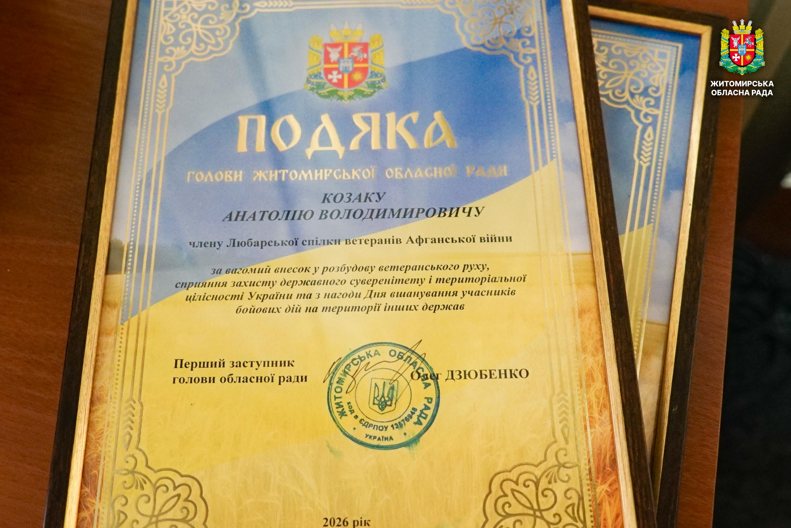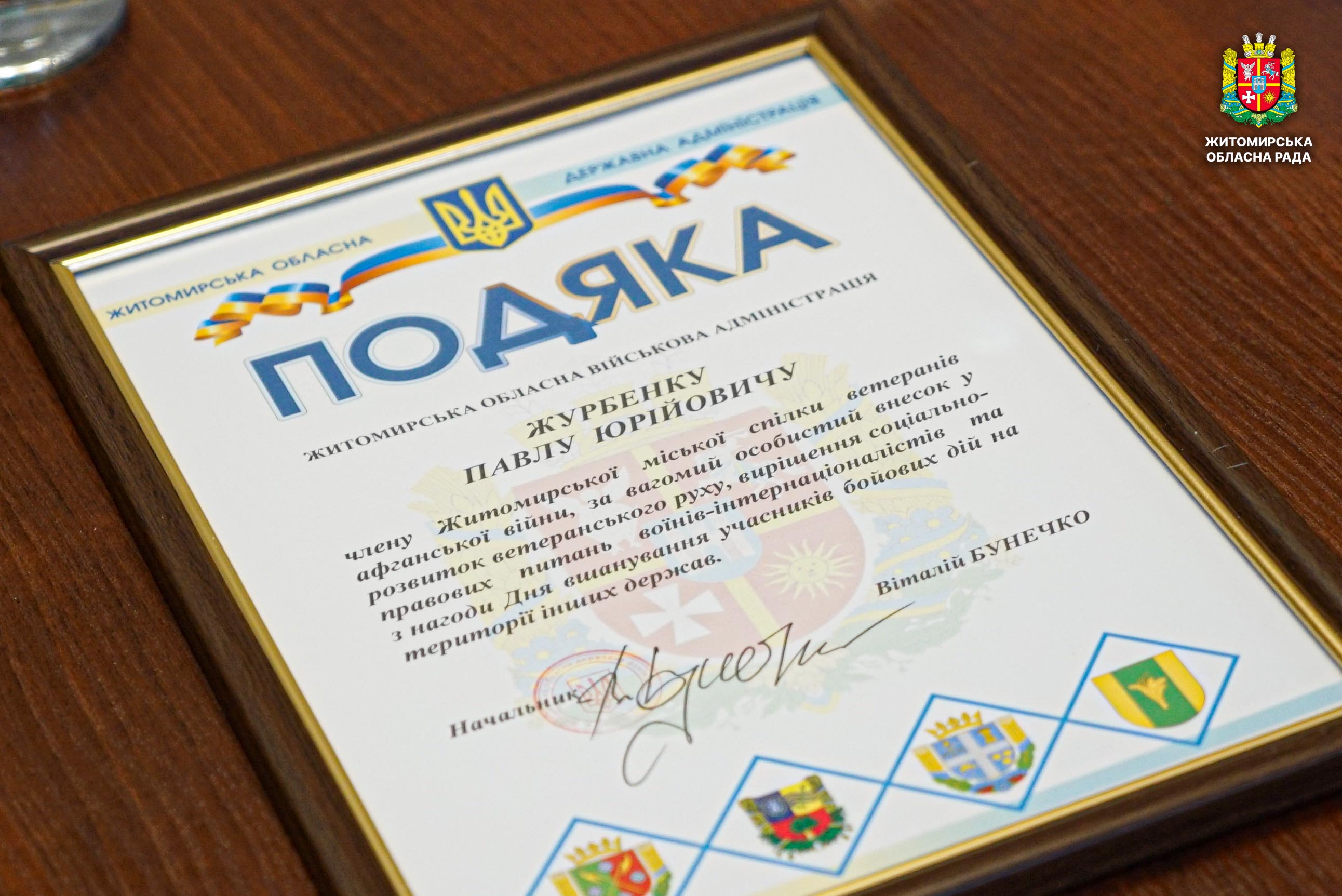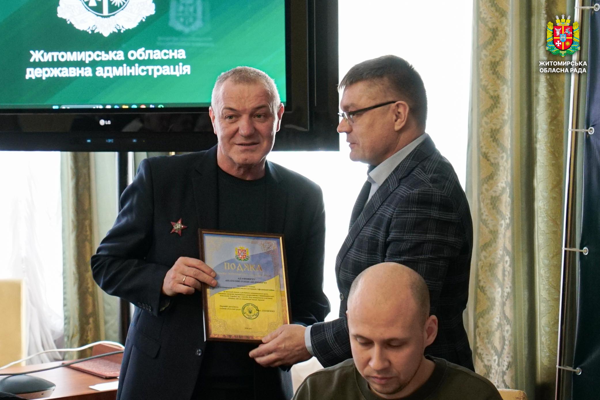 Відзначення та діалог: відбулася нарада з ветеранськими організаціями учасників бойових дій на території інших держав 12 лютого відбулася робоча нарада з керівниками та представниками громадських організацій ветеранів війни на території інших держав. Захід розпочався хвилиною мовчання на вшанування пам’яті полеглих захисників і захисниць України та виконанням Державного Гімну. У нараді, яку провів заступник начальника Житомирської обласної військової адміністрації Віктор Градівський, взяли участь директорка Департаменту охорони здоров'я ОВА, депутатка Житомирської обласної ради Валентина Донець, депутати обласної ради Валерій Прокопчук, Павло Журбенко, Олег Казюк, начальник Управління з питань ветеранської політики ОВА Денис Соколовський, представники Головного управління Пенсійного фонду України в Житомирській області. Під час зустрічі обговорили актуальні питання діяльності громадських організацій ветеранів війни на території інших держав, а також напрями поглиблення співпраці з ветеранськими об’єднаннями. Наголошувалося, що ветерани війни на території інших держав є важливою частиною ветеранського руху. Їхній життєвий і бойовий досвід, активна громадянська позиція та діяльність організацій відіграють значну роль у соціальній підтримці ветеранів і членів їхніх сімей. Також під час обговорення було окреслено проблемні питання, з якими стикаються ветерани, та напрацьовано пропозиції щодо їх вирішення і підтримки ветеранських ініціатив. Про результати діяльності Житомирської обласної спілки ветеранів афганської війни поінформували члени правління Юрій Клевцов і Юрій Панасюк. Голова Житомирської обласної організації учасників миротворчих операцій «Солдати миру» Сергій Коробцов зупинився на питаннях організації співпраці між ветеранськими об’єднаннями. Під час заходу відбулося нагородження ветеранів відзнаками Житомирської обласної ради та Житомирської обласної військової адміністраціїї. Зокрема, Подякою голови Житомирської обласної ради нагороджено заступника голови Житомирської міської спілки ветеранів Афганської війни Анатолія Адамовича та члена Любарської спілки ветеранів Афганської війни Анатолія Козака за вагомий внесок у розбудову ветеранського руху, сприяння захисту державного суверенітету і територіальної цілісності України та з нагоди Дня вшанування учасників бойових дій на території інших держав. Подякою начальника Житомирської обласної військової адміністрації відзначено члена Житомирської міської спілки ветеранів Афганської війни, депутата Житомирської обласної ради Павла Журбенка. Учасника бойових дій на теритрії інших держав, депутата Житомирської обласної ради Олега Казюка нагороджено відзнакою «Честь і слава Житомирщини».