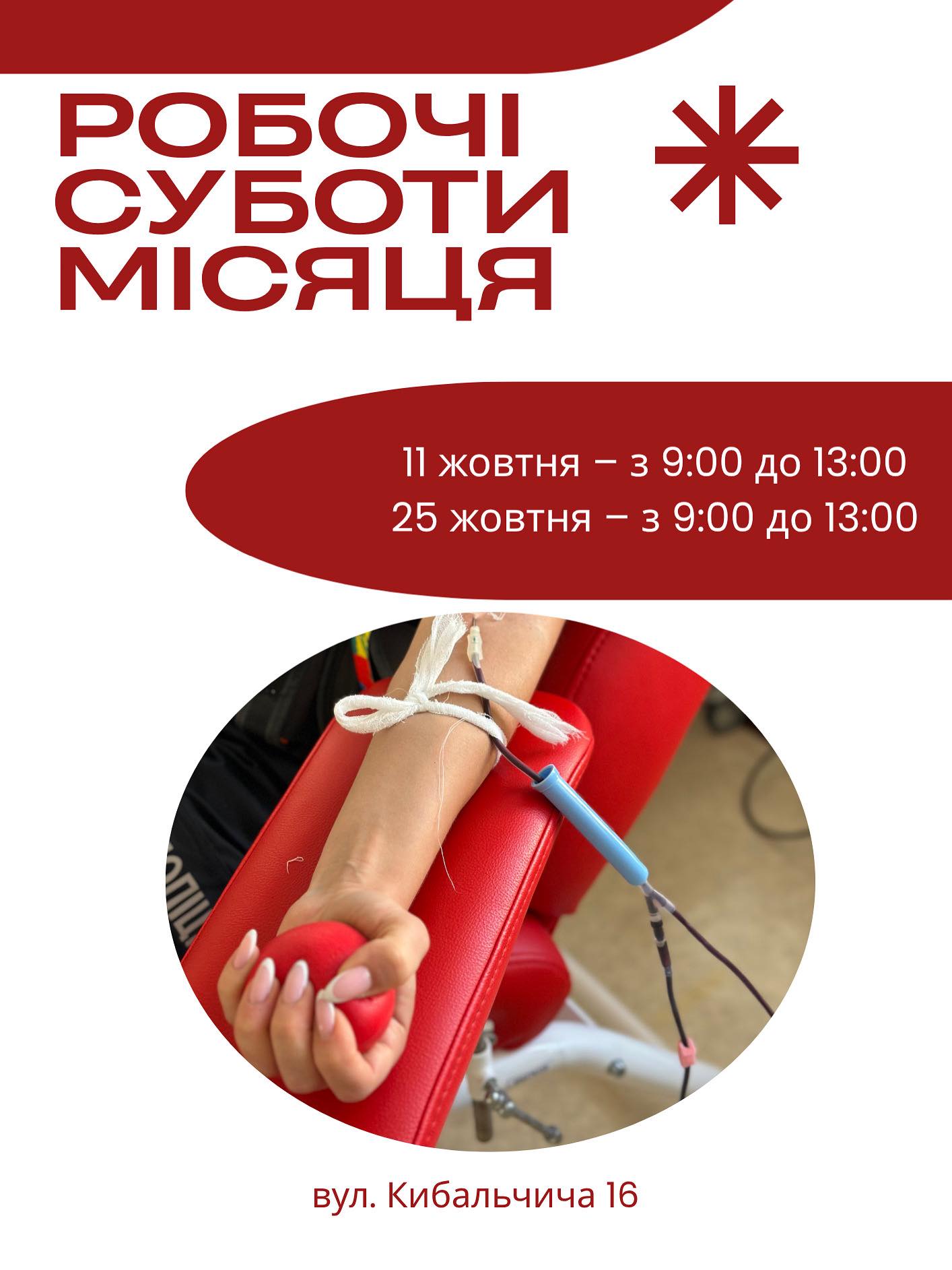 Житомирський обласний центр крові має потребу у донорах усіх груп крові Житомирський обласний центр крові надає кров пацієнтам усіх лікувальних закладів Житомирської області. Донором може стати кожен, хто відповідає таким критеріям: вік від 18 років; вага не менше 50 кг; відсутність медичних протипоказань. визначених МОЗ України. Графік роботи Центру крові: ▪️ у будні – з 08:00 до 13:00 ▪️ у суботу – з 09:00 до 13:00 Робочі суботи у жовтні: 11 та 25 жовтня. Адреса: м. Житомир, вул. Кибальчича, 16 Телефон для довідок: +38063 822 19 62 Кожна ваша донація – це шанс на життя для тих, хто цього потребує. Приходьте та рятуйте життя!