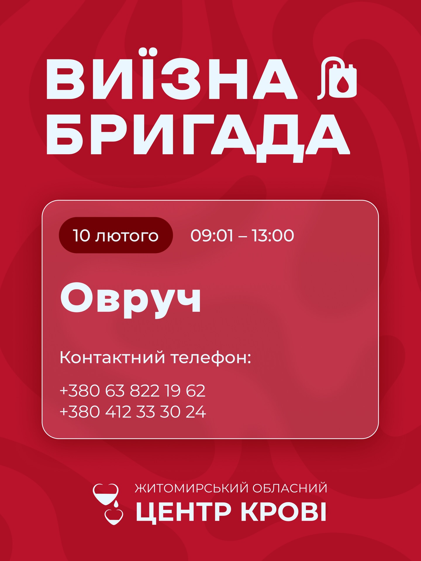 Житомирський обласний центр крові потребує донорів усіх груп крові Житомирський обласний центр крові забезпечує кров’ю пацієнтів усіх лікувальних закладів Житомирської області. Донором може стати кожен, хто має відповідний стан здоров’я, вік від 18 років, вагу не менше 50 кг та не має протипоказань, визначених МОЗ України. Житомирський обласний центр крові працює щоденно з 8:00 до 13:00, крім суботи та неділі. Робочі суботи у лютому: 14 та 28 лютого. Адреса центру: м. Житомир, вул. Кибальчича, 16. Також Житомирський обласний центр крові регулярно здійснює виїзні забори крові в громадах Житомирщини. Графік виїздів у лютому: • 10 лютого — м. Овруч; • 12 лютого — с. Райгородок; • 17 лютого — м. Олевськ. Детальна інформація щодо виїздів — в інформаційних матеріалах нижче або на сторінці центру у Фейсбук. Підтримай донорський рух! Кров рятує життя!