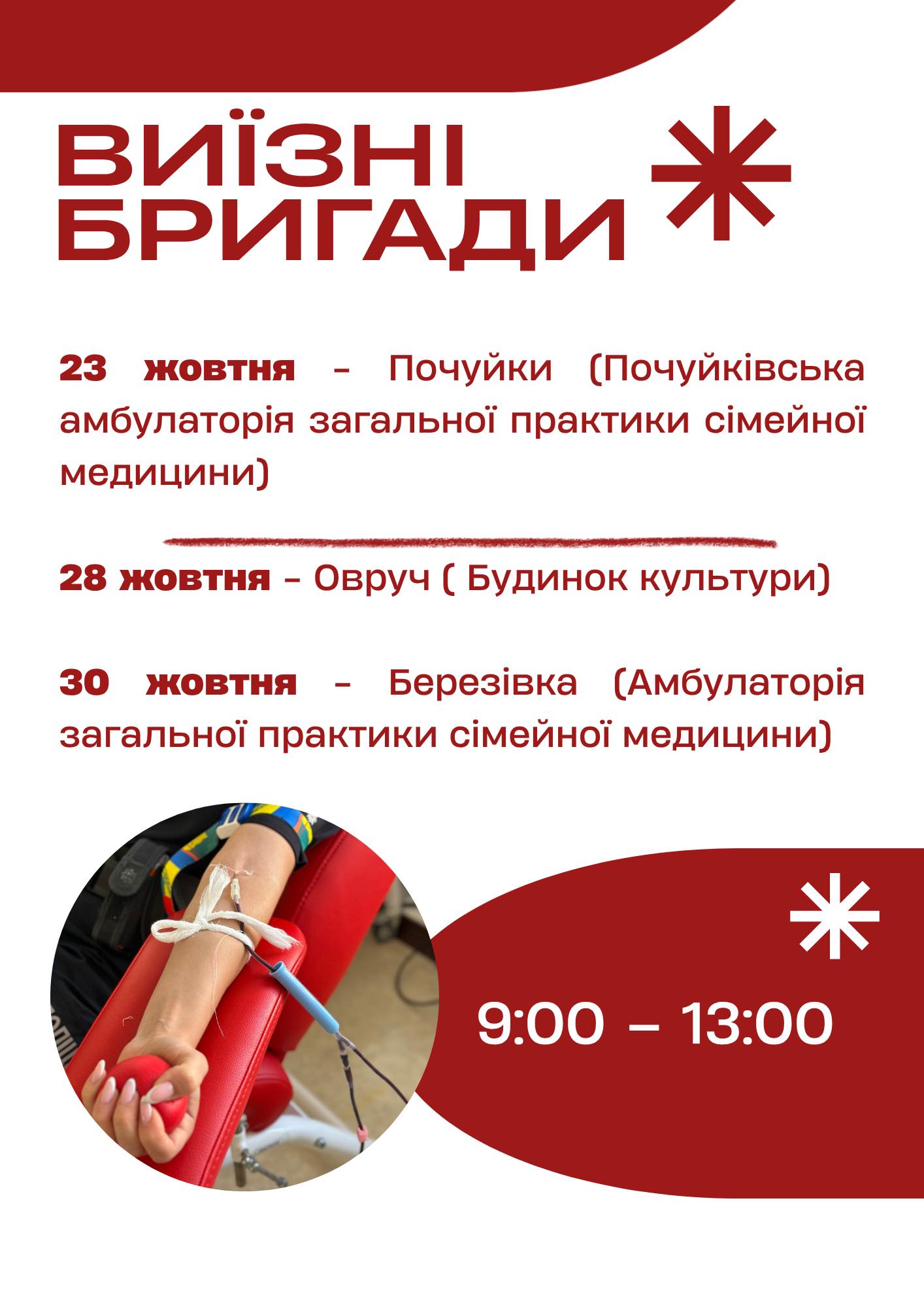 Житомирський обласний центр крові здійснює виїзди до громад області для забору крові Графік виїздів у жовтні: 23.10 - с. Почуйки (Почуйківська амбулаторія загальної практики сімейної медицини) 28.10 - м. Овруч (Будинок культури) 29.10 - м. Коростень (Ліцей №9) 30.10 - с. Березівка (Амбулаторія загальної практики сімейної медицини) Умови: Мати при собі паспорт та обов'язково бути здоровим. Час роботи мобільного пункту: з 09:00 до 13:00. Долучайтеся до важливої ініціативи! Ваша кров може врятувати життя. Детальну інформацію про донацію крові можна отримати за телефоном: +380 63 822 1962 або у соціальних мережах центр: 🌐Facebook🌐Instagram