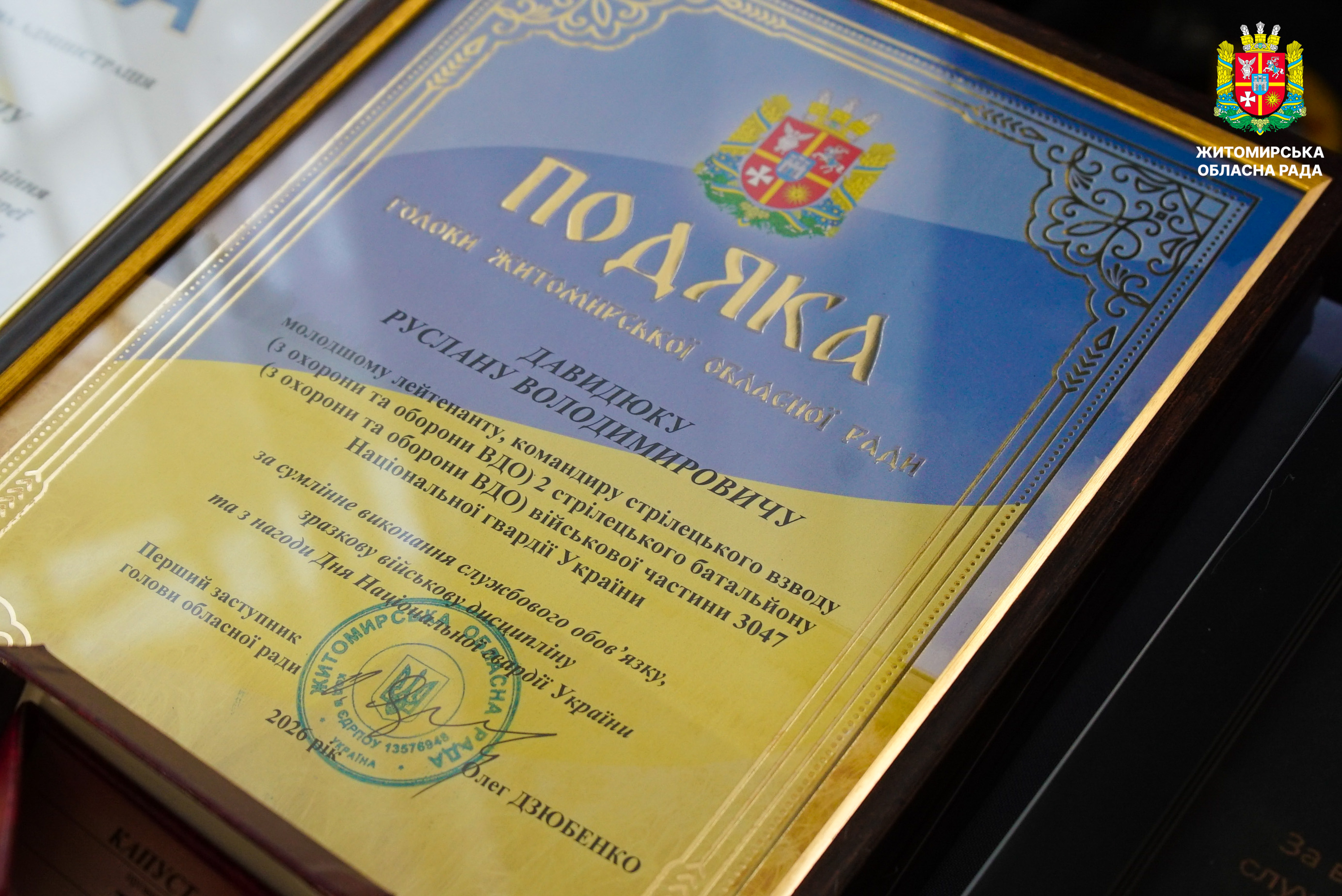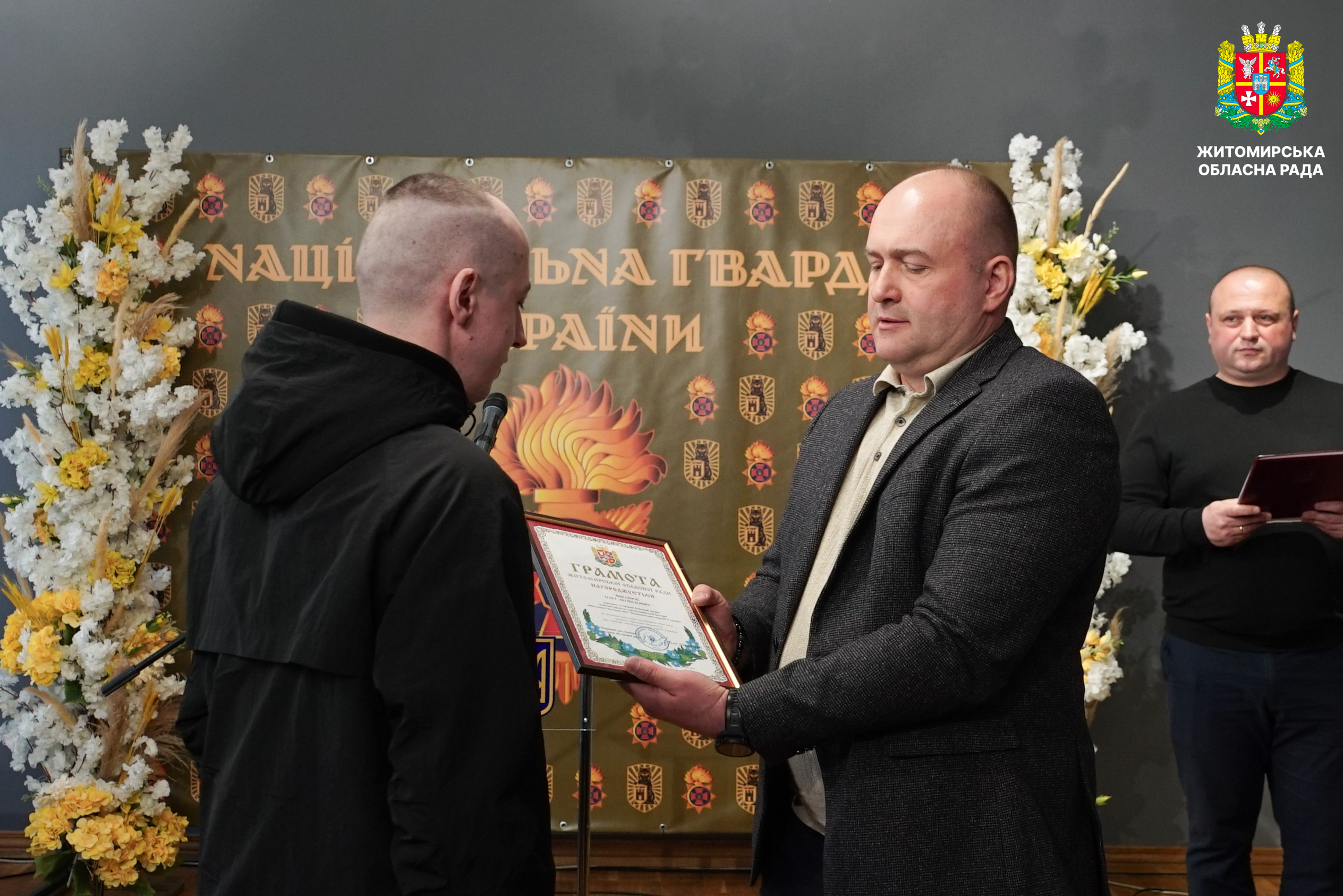 У Житомирі відбулися урочистості з нагоди 12-ї річниці створення Національної гвардії України 26 березня у Житомирі відбувся урочистий захід до Дня Національної гвардії України — професійного свята, що відзначає роль Національної гвардії у захисті суверенітету України, її територіальної цілісності, життя, законних прав і свобод громадян. У заході взяли участь перший заступник голови Житомирської обласної ради Олег Дзюбенко, начальник Житомирської обласної військової адміністрації Віталій Бунечко, секретар Житомирської міської ради Галина Шиманська, представники духовенства та військові. Від імені всього депутатського корпусу та від себе особисто Олег Дзюбенко привітав військовослужбовців із професійним святом, а також вручив грамоти та подяки. «Ваша служба — це внесок у безпеку і стабільність нашої країни. Ви завжди на варті життя і спокою. Дякуємо вам за силу духу та відданість обов’язку. Окрема подяка вашим родинам, адже за кожним сильним воїном стоять ті, хто чекає, підтримує і вірить», — зазначив Олег Дзюбенко у своєму вітальному слові. З привітаннями до присутніх також звернулися начальник Житомирської ОВА, секретар міської ради, представники духовенства та інші гості. Під час заходу діяла фотовиставка «Війна в об’єктиві», присвячена 12-й річниці створення Національної гвардії України. У світлинах — щоденне життя гвардійців, їхня служба, випробування війною та цінність простих людських моментів.