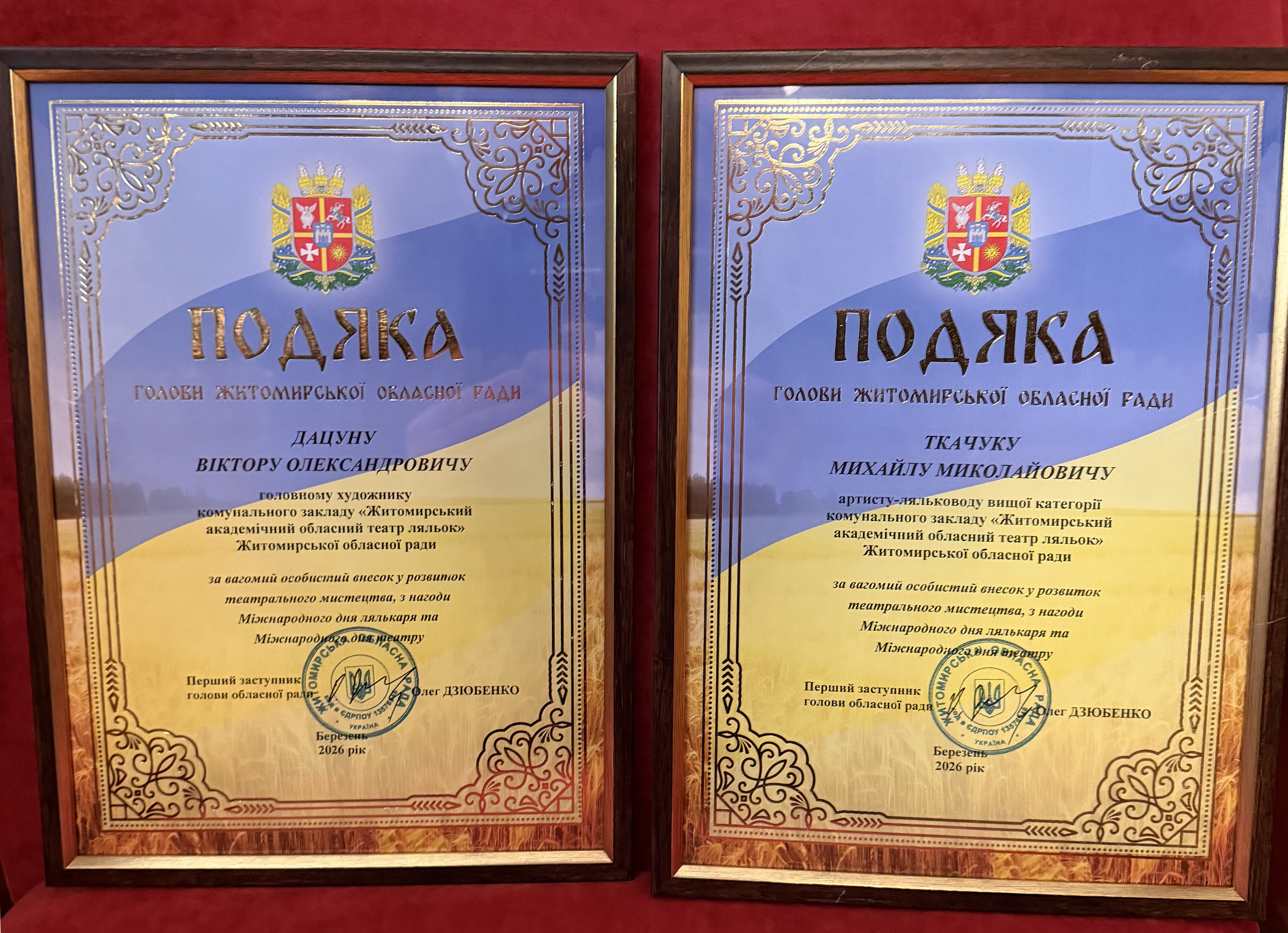 У Житомирі відзначили Міжнародний день лялькаря прем’єрою рок-мюзиклу 21 березня, у Міжнародний день лялькаря, у комунальному закладі «Житомирський академічний обласний театр ляльок» Житомирської обласної ради відбулися урочистості та прем’єра рок-мюзиклу «Кошеня Шм’як». З нагоди професійного свята заклад відвідав депутат Житомирської обласної ради Олександр Дмитрук, який від імені керівництва обласної ради та депутатського корпусу привітав колектив театру, подякував за відданість професії, вагомий внесок у розвиток театрального мистецтва області та побажав подальших творчих здобутків. Також він вручив Подяки голови Житомирської обласної ради. За високий професіоналізм, вагомий особистий внесок у розвиток театрального мистецтва Житомирської області, активну громадську діяльність в умовах воєнного стану та з нагоди Міжнародного дня лялькаря подяками відзначено: Віктора Дацуна — головного художника комунального закладу «Житомирський академічний обласний театр ляльок» Житомирської обласної ради; Михайла Ткачука — артиста-ляльковода вищої категорії комунального закладу «Житомирський академічний обласний театр ляльок» Житомирської обласної ради. Після урочистої частини глядачам представили прем’єру рок-мюзиклу «Кошеня Шм’як», яка стала святковою подією для поціновувачів театрального мистецтва. Житомирський академічний обласний театр ляльок і надалі залишається важливим осередком культурного життя області, поєднуючи традиції та сучасні творчі підходи.
