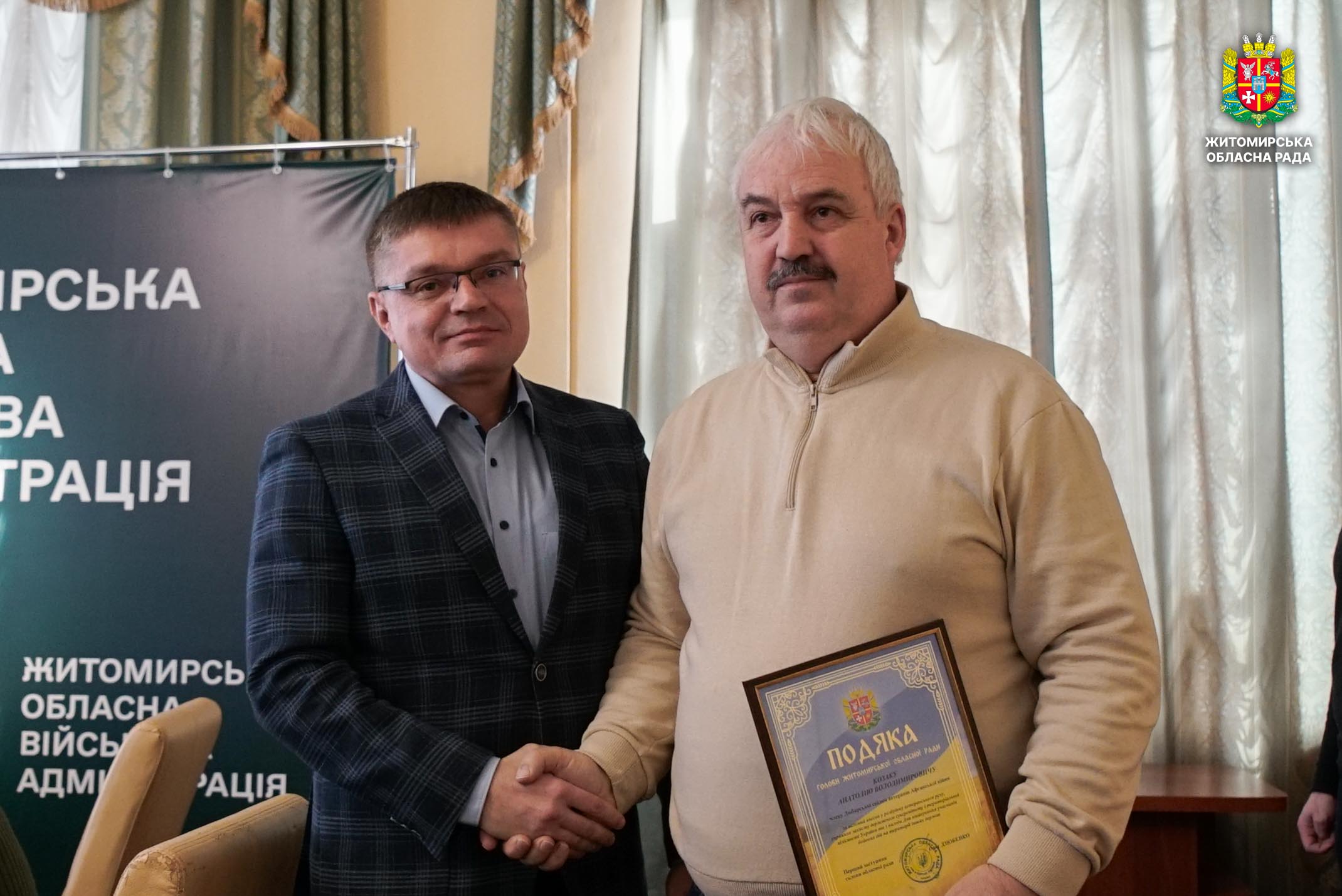 Відзначення та діалог: відбулася нарада з ветеранськими організаціями учасників бойових дій на території інших держав 12 лютого відбулася робоча нарада з керівниками та представниками громадських організацій ветеранів війни на території інших держав. Захід розпочався хвилиною мовчання на вшанування пам’яті полеглих захисників і захисниць України та виконанням Державного Гімну. У нараді, яку провів заступник начальника Житомирської обласної військової адміністрації Віктор Градівський, взяли участь директорка Департаменту охорони здоров'я ОВА, депутатка Житомирської обласної ради Валентина Донець, депутати обласної ради Валерій Прокопчук, Павло Журбенко, Олег Казюк, начальник Управління з питань ветеранської політики ОВА Денис Соколовський, представники Головного управління Пенсійного фонду України в Житомирській області. Під час зустрічі обговорили актуальні питання діяльності громадських організацій ветеранів війни на території інших держав, а також напрями поглиблення співпраці з ветеранськими об’єднаннями. Наголошувалося, що ветерани війни на території інших держав є важливою частиною ветеранського руху. Їхній життєвий і бойовий досвід, активна громадянська позиція та діяльність організацій відіграють значну роль у соціальній підтримці ветеранів і членів їхніх сімей. Також під час обговорення було окреслено проблемні питання, з якими стикаються ветерани, та напрацьовано пропозиції щодо їх вирішення і підтримки ветеранських ініціатив. Про результати діяльності Житомирської обласної спілки ветеранів афганської війни поінформували члени правління Юрій Клевцов і Юрій Панасюк. Голова Житомирської обласної організації учасників миротворчих операцій «Солдати миру» Сергій Коробцов зупинився на питаннях організації співпраці між ветеранськими об’єднаннями. Під час заходу відбулося нагородження ветеранів відзнаками Житомирської обласної ради та Житомирської обласної військової адміністраціїї. Зокрема, Подякою голови Житомирської обласної ради нагороджено заступника голови Житомирської міської спілки ветеранів Афганської війни Анатолія Адамовича та члена Любарської спілки ветеранів Афганської війни Анатолія Козака за вагомий внесок у розбудову ветеранського руху, сприяння захисту державного суверенітету і територіальної цілісності України та з нагоди Дня вшанування учасників бойових дій на території інших держав. Подякою начальника Житомирської обласної військової адміністрації відзначено члена Житомирської міської спілки ветеранів Афганської війни, депутата Житомирської обласної ради Павла Журбенка. Учасника бойових дій на теритрії інших держав, депутата Житомирської обласної ради Олега Казюка нагороджено відзнакою «Честь і слава Житомирщини».