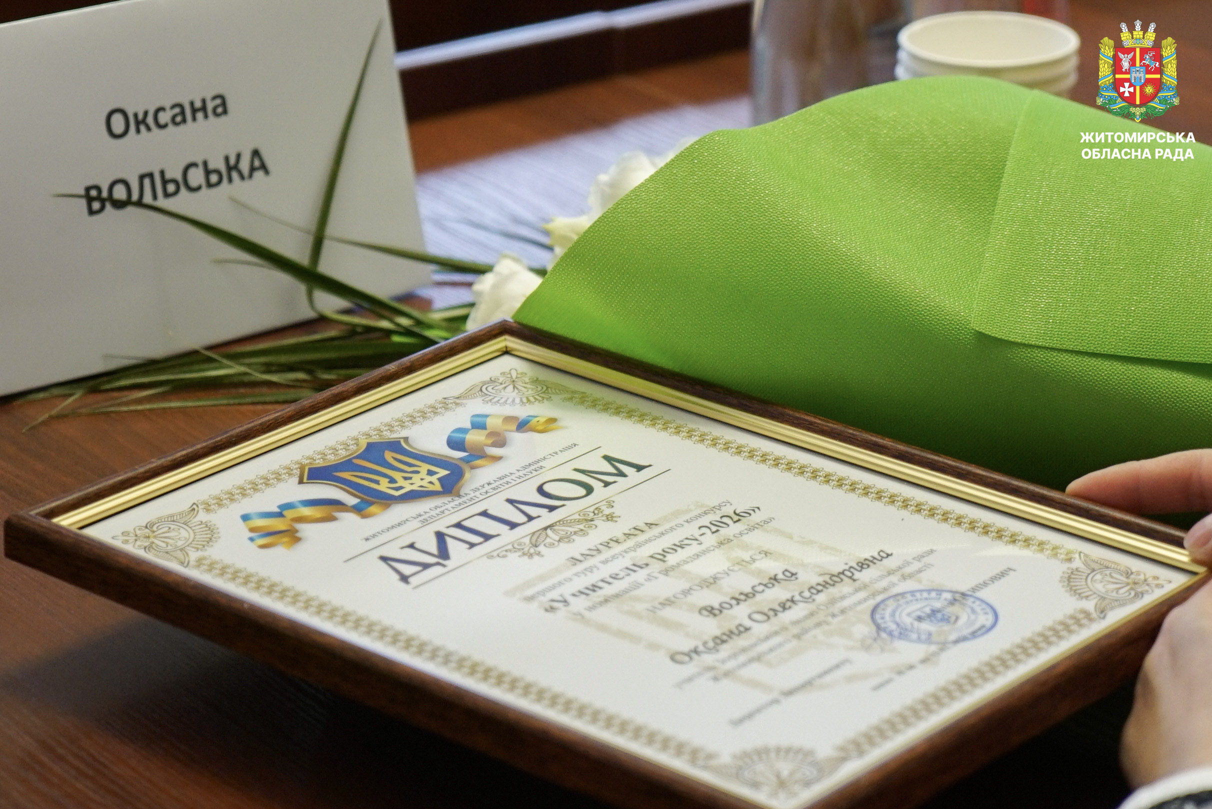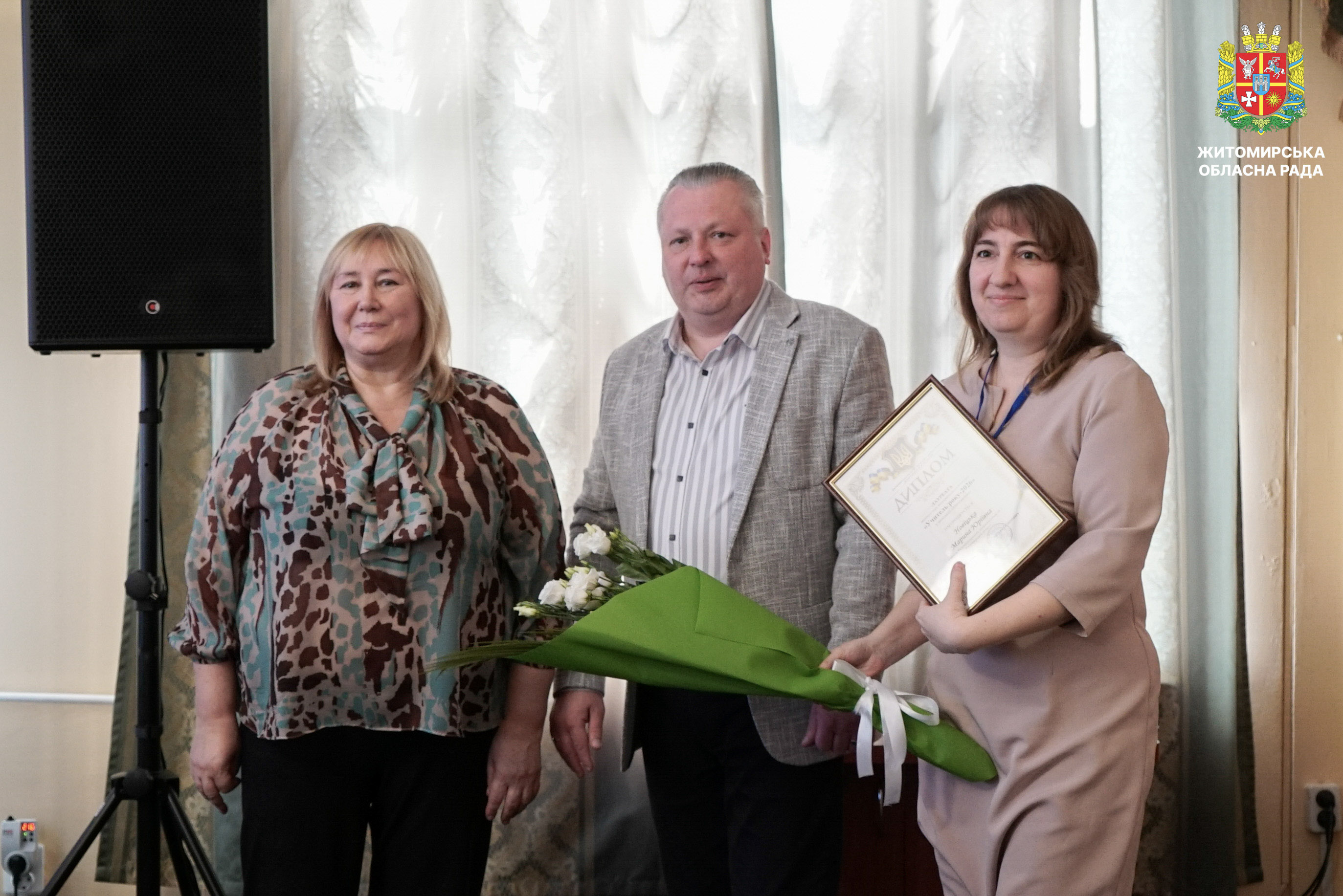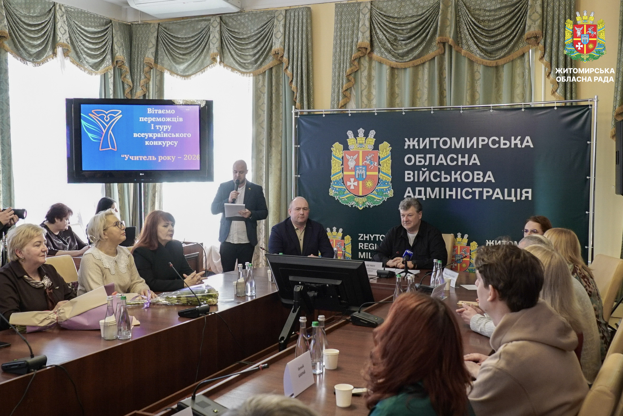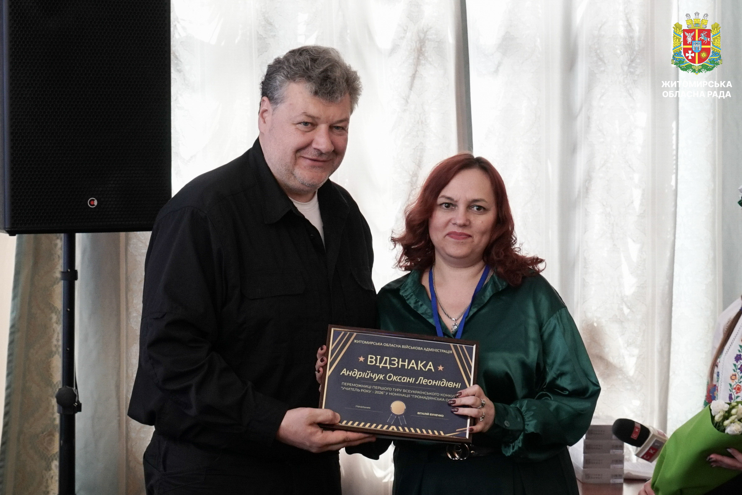 Відзначено переможців і лауреатів першого туру конкурсу «Учитель року – 2026» 17 березня у малій залі Житомирської обласної ради відбулася урочиста церемонія нагородження переможців і лауреатів першого туру Всеукраїнського конкурсу «Учитель року – 2026». Участь у заході взяли перший заступник голови Житомирської обласної ради Олег Дзюбенко, начальник Житомирської обласної військової адміністрації Віталій Бунечко та його заступниця Наталія Арендарчук, директорка Департаменту освіти і науки обласної військової адміністрації Наталія Осипович, керівники органів управління освітою територіальних громад області, а також представники Житомирського обласного інституту післядипломної педагогічної освіти. У межах першого туру конкурсу освітяни Житомирщини змагалися у чотирьох номінаціях: «Громадянська освіта», «Англійська мова», «Математика» та «Початкова освіта». Переможцями першого туру Всеукраїнського конкурсу «Учитель року – 2026» стали: • Євген Шахрай, учитель математики Ліцею №12 міста Житомира; • Оксана Андрійчук, учителька предмета «Громадянська освіта» Ліцею №11 Звягельської міської ради; • Олена Разінкіна, учителька англійської мови Ліцею №1 імені Густава Олізара Коростишівської міської ради; • Світлана Чос, учителька початкових класів Новогуйвинського ліцею імені Сергія Процика. Переможців нагороджено відзнаками Житомирської обласної військової адміністрації. Лауреатів відзначено грамотами Житомирської обласної ради. Нагороди вручив перший заступник голови обласної ради Олег Дзюбенко, який привітав учасників першого туру конкурсу та побажав переможцям успіху на всеукраїнському етапі. «Праця вчителя надзвичайно важлива. Вона не лише дає знання, а й допомагає учням розвивати свої таланти й вірити у власні сили. Вона формує їхнє майбутнє, а відтак і майбутнє нашої країни. Щиро дякую вам, шановні вчителі, за вашу відданість покликанню, терпіння, любов до дітей та своєї справи», — зазначив у своїй вітальній промові Олег Дзюбенко. Грамотою Житомирської обласної ради нагороджені: • Леся Кухарська, учителька Ліцею №12 міста Житомира; • Анжела Карі, учителька Брусилівського ліцею імені І.І. Огієнка; • Марина Болсунівська, учителька Коростенського міського ліцею №2 імені Володимира Сингаївського; • Сергій Герасимчук, учитель Ліцею №2 імені Л.Х. Дарбіняна Коростишівської міської ради. Також лауреати конкурсу були відзначені дипломами Департаменту освіти і науки Житомирської обласної військової адміністрації. Відзнаки отримали: •Оксана Вольська, учителька Зороківського ліцею Оліївської сільської ради;• Альона Чернявська, учителька Ліцею №22 міста Житомира імені Василя Михайловича Кавуна;• Владислава Устимчук, учителька Коростенського міського ліцею №1 Житомирської області;• Марина Новіцька, учителька Радомишльського опорного ліцею №2 Житомирської області. Всеукраїнський конкурс «Учитель року» вже понад три десятиліття об’єднує найкращих педагогів країни, сприяє розвитку професійної майстерності та популяризації педагогічної праці. Житомирська обласна рада вітає переможців і лауреатів конкурсу та бажає подальших професійних успіхів і нових досягнень.