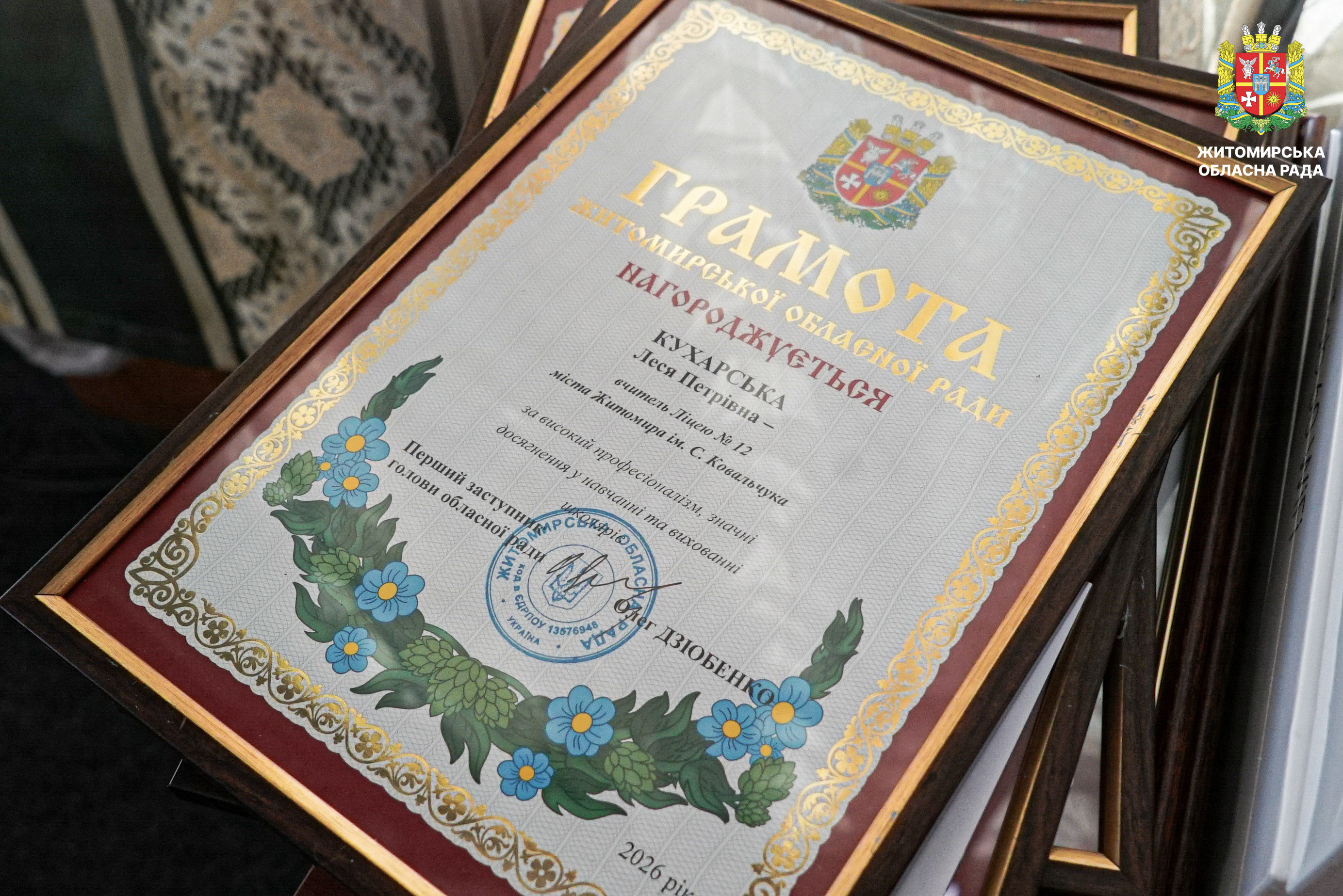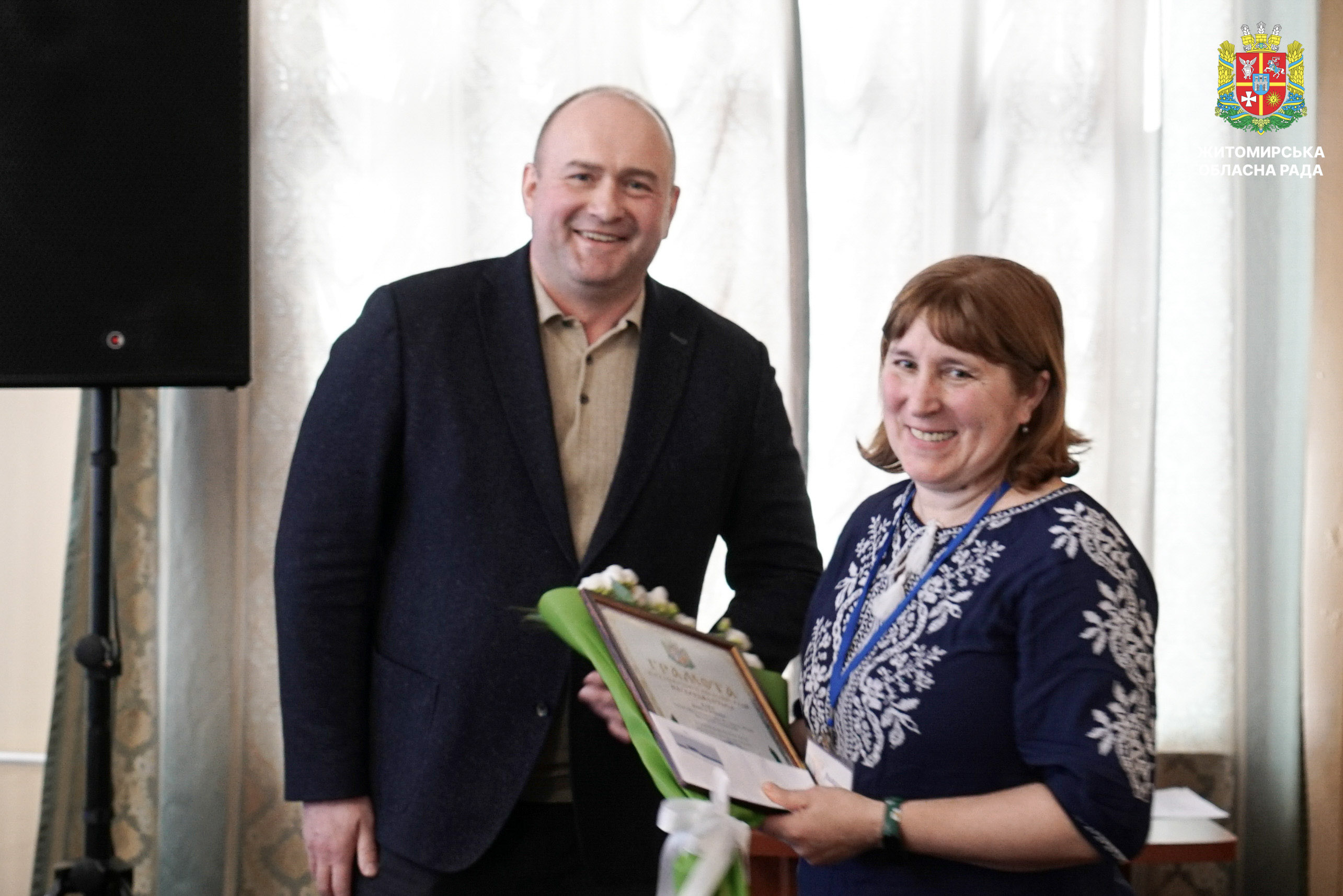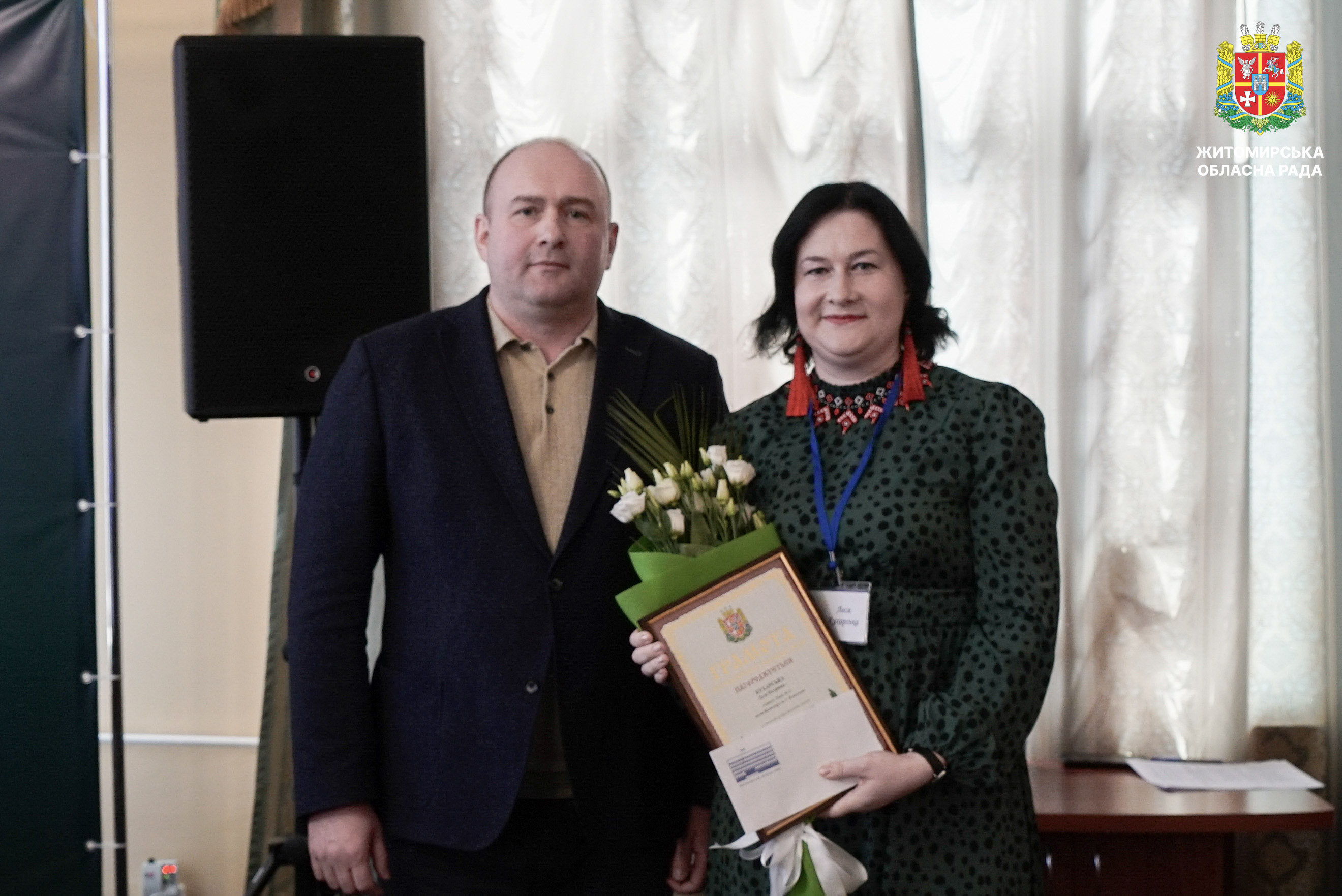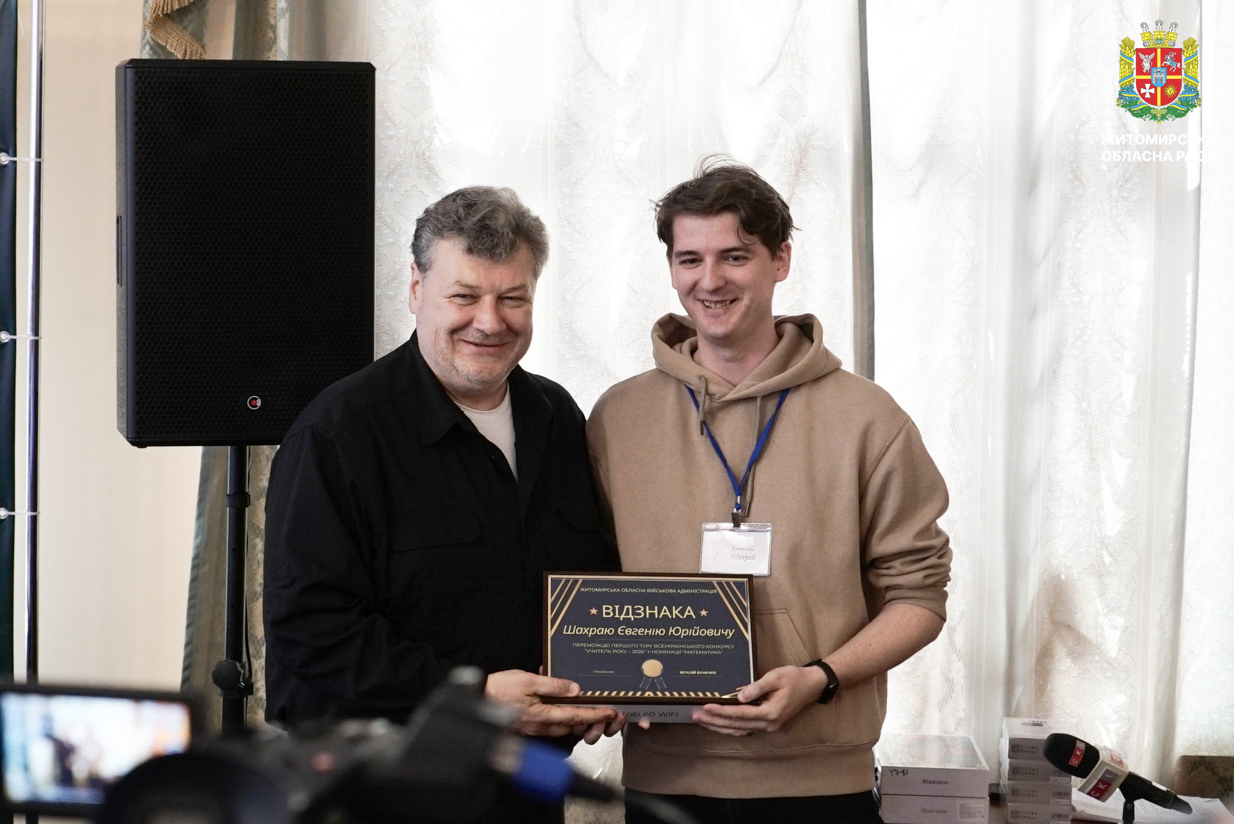 Відзначено переможців і лауреатів першого туру конкурсу «Учитель року – 2026» 17 березня у малій залі Житомирської обласної ради відбулася урочиста церемонія нагородження переможців і лауреатів першого туру Всеукраїнського конкурсу «Учитель року – 2026». Участь у заході взяли перший заступник голови Житомирської обласної ради Олег Дзюбенко, начальник Житомирської обласної військової адміністрації Віталій Бунечко та його заступниця Наталія Арендарчук, директорка Департаменту освіти і науки обласної військової адміністрації Наталія Осипович, керівники органів управління освітою територіальних громад області, а також представники Житомирського обласного інституту післядипломної педагогічної освіти. У межах першого туру конкурсу освітяни Житомирщини змагалися у чотирьох номінаціях: «Громадянська освіта», «Англійська мова», «Математика» та «Початкова освіта». Переможцями першого туру Всеукраїнського конкурсу «Учитель року – 2026» стали: • Євген Шахрай, учитель математики Ліцею №12 міста Житомира; • Оксана Андрійчук, учителька предмета «Громадянська освіта» Ліцею №11 Звягельської міської ради; • Олена Разінкіна, учителька англійської мови Ліцею №1 імені Густава Олізара Коростишівської міської ради; • Світлана Чос, учителька початкових класів Новогуйвинського ліцею імені Сергія Процика. Переможців нагороджено відзнаками Житомирської обласної військової адміністрації. Лауреатів відзначено грамотами Житомирської обласної ради. Нагороди вручив перший заступник голови обласної ради Олег Дзюбенко, який привітав учасників першого туру конкурсу та побажав переможцям успіху на всеукраїнському етапі. «Праця вчителя надзвичайно важлива. Вона не лише дає знання, а й допомагає учням розвивати свої таланти й вірити у власні сили. Вона формує їхнє майбутнє, а відтак і майбутнє нашої країни. Щиро дякую вам, шановні вчителі, за вашу відданість покликанню, терпіння, любов до дітей та своєї справи», — зазначив у своїй вітальній промові Олег Дзюбенко. Грамотою Житомирської обласної ради нагороджені: • Леся Кухарська, учителька Ліцею №12 міста Житомира; • Анжела Карі, учителька Брусилівського ліцею імені І.І. Огієнка; • Марина Болсунівська, учителька Коростенського міського ліцею №2 імені Володимира Сингаївського; • Сергій Герасимчук, учитель Ліцею №2 імені Л.Х. Дарбіняна Коростишівської міської ради. Також лауреати конкурсу були відзначені дипломами Департаменту освіти і науки Житомирської обласної військової адміністрації. Відзнаки отримали: •Оксана Вольська, учителька Зороківського ліцею Оліївської сільської ради;• Альона Чернявська, учителька Ліцею №22 міста Житомира імені Василя Михайловича Кавуна;• Владислава Устимчук, учителька Коростенського міського ліцею №1 Житомирської області;• Марина Новіцька, учителька Радомишльського опорного ліцею №2 Житомирської області. Всеукраїнський конкурс «Учитель року» вже понад три десятиліття об’єднує найкращих педагогів країни, сприяє розвитку професійної майстерності та популяризації педагогічної праці. Житомирська обласна рада вітає переможців і лауреатів конкурсу та бажає подальших професійних успіхів і нових досягнень.