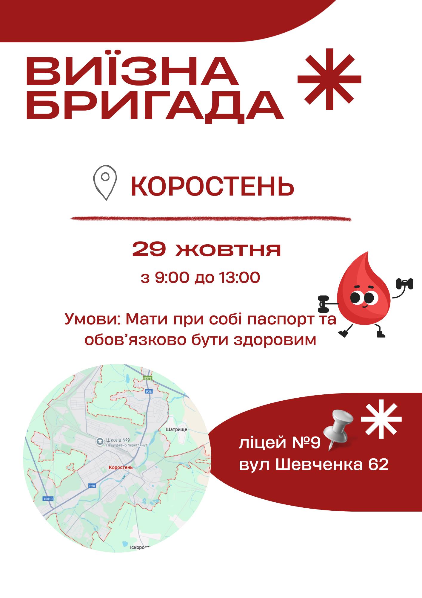 Житомирський обласний центр крові здійснює виїзди до громад області для забору крові Графік виїздів у жовтні: 23.10 - с. Почуйки (Почуйківська амбулаторія загальної практики сімейної медицини) 28.10 - м. Овруч (Будинок культури) 29.10 - м. Коростень (Ліцей №9) 30.10 - с. Березівка (Амбулаторія загальної практики сімейної медицини) Умови: Мати при собі паспорт та обов'язково бути здоровим. Час роботи мобільного пункту: з 09:00 до 13:00. Долучайтеся до важливої ініціативи! Ваша кров може врятувати життя. Детальну інформацію про донацію крові можна отримати за телефоном: +380 63 822 1962 або у соціальних мережах центр: 🌐Facebook🌐Instagram